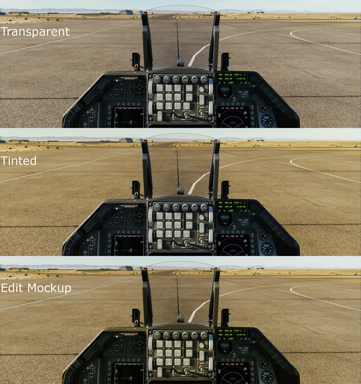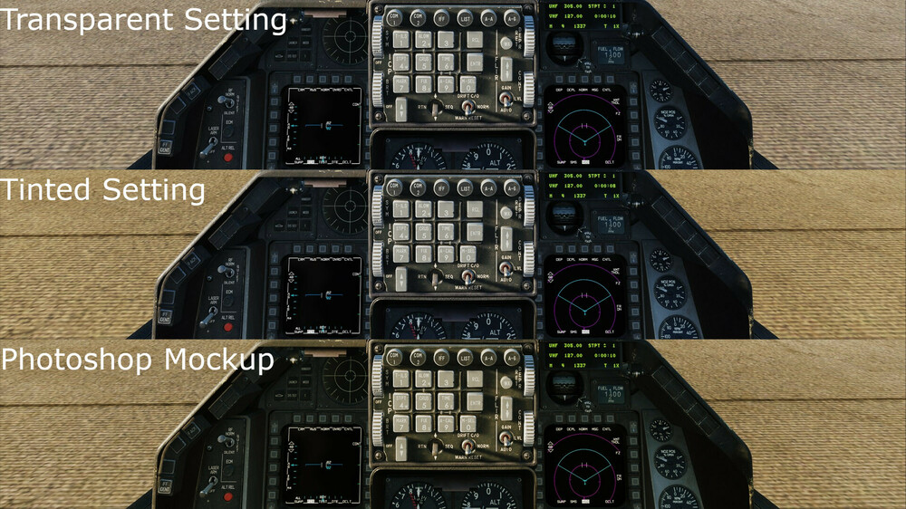 Currently the yellow canopy Tint only affects how the outside world is viewed, but does not change color of the sunlight coming into the Cockpit. This makes the interior look alot more blue-ish in comparison. I made a quick Comparison and Mockup Edit in Photoshop to better bring across my point. The Mockup Edit was created by taking the Transparent Screenshot, and adjusting the Yellow Levels to achieve a similar outside color as the Tinted option.