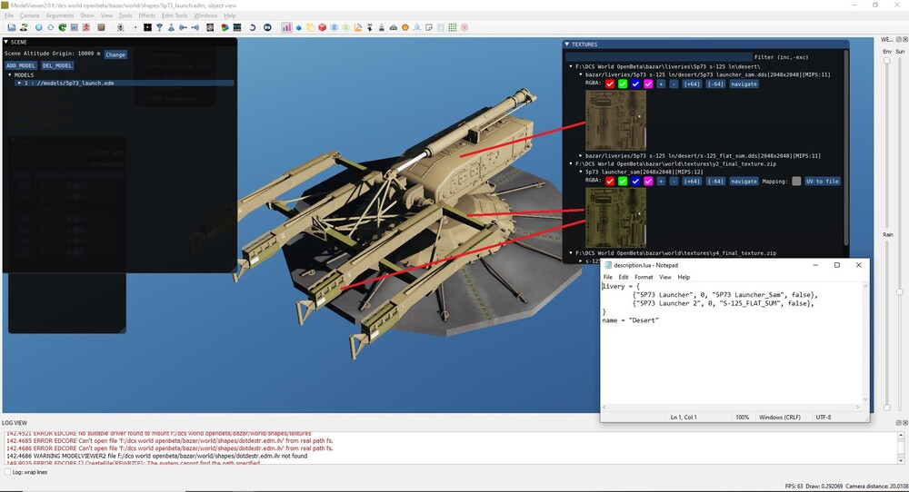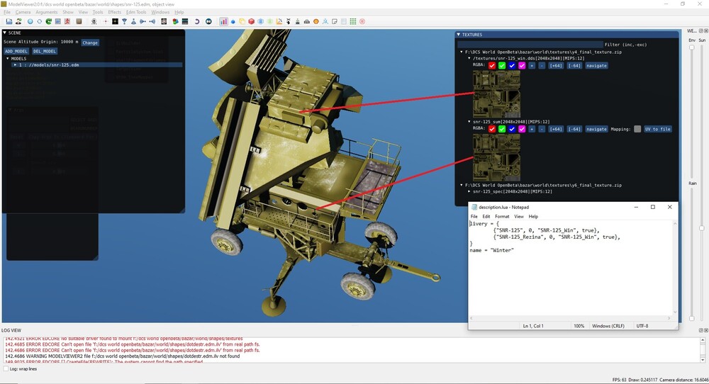 I was making a livery pack when I noticed a bug with the description.lua files from the SA-3 Launcher and SA-3 Tracking Radar. With the current .lua files, certain parts of the models stay in their default textures. Most noticeable with winter and desert liveries. Here are screenshots from Modelviewer: Bugged Desert Livery: Bugged Winter Livery: Bugged Desert Livery: Here is how to fix the issue, you need to add the red underlined line in every description.lua of any livery that is different from the default livery: Desert livery after fix: Desert livery after fix: Thanks.