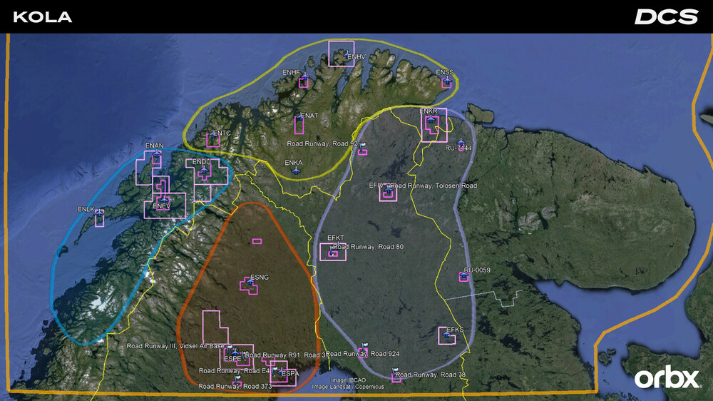 DCS: Kola is now available in Early Access on Orbx Direct, in the Eagle Dynamics E-Shop, and on Steam. The far reaches of northern Europe are generally described as a world of raw beauty and quiet grandeur, where rolling hills meet dramatic fjords, and myriad lakes reflect dense forests and the tranquil sky (whoever wrote this sentence is an incurable romantic). However, these same landscapes are also host to conflict-laden topics such as past and present geopolitical tensions and alliances, access to ice-free ports and Arctic waters, extensive mineral resources, nuclear weapons and storage, national and regional defense strategies, and military exercises and winter training (now we are talking!). Orbx proudly presents the DCS: Kola map, which covers northern Norway, Sweden, Finland, and the Russian Murmansk Oblast and parts of the Karelia region. The map also includes large areas of the Barents Sea and Norwegian Sea to the north and west, ideal for aircraft carrier operations. The Orbx DCS: Kola map is represented in its current-day state, with some allowance for late-Cold War military features and functionality. Normally priced at USD 69.99, the early release of Kola will be offered at a 20% discount, reducing the price to USD 55.99 (excluding all applicable taxes). The purchase price may also increase as the map evolves with further content. These FAQs are meant to answer the most common questions and will be updated and expanded over time. Who is Orbx? Orbx is an Australian owned developer and publisher of add-ons and expansions for flight simulation software and known for creating high-quality scenery enhancements, aircraft, and other add-ons for popular platforms like Microsoft Flight Simulator, Prepar3D, and X-Plane. Our products can be found here: orbxdirect.com With the release of DCS: Kola map we are very excited to join a number of prestigious third-party developers creating high-quality content for DCS. How much hard drive space is required for DCS: Kola? At the time of launch the map requires approx. 150GB of free hard drive space. With more content planned in the future, especially a full set of winter textures, this will likely increase further. That being said, with additional optimisation being worked on in parallel with new content, we hope to not increase the overall map file size much more. What is included in DCS: Kola at the launch of early access? The Kola map spans about 1,400 km east-west by 1,000 km north-south, with more than 575,000 sq km of land and a total coverage area of ~1,350,000 sq km. Its southern boundary roughly aligns with 65 degrees latitude, meaning most of the map area falls within the Arctic Circle. Right from the beginning of its early-access phase, DCS: Kola includes its entire coverage area, with detailed terrain, summer ground textures, shorelines, thousands of lakes, most rivers, and the main transportation network already in place; more than half a million sq km for you to explore! In regards to high-detail areas and military installations, this initial release focuses on an area spanning the Finland/Russia border, encompassing central Finland and the western parts of the Murmansk and Karelia regions of Russia. The map below highlights the focus area, in green, while also indicating the additional airports in Norway and Sweden. Key Features of the Early Access Release ● Complete base terrain for the entire map area, with highly detailed topography, summer ground textures, shorelines, and lakes and rivers. ● An initial focus area spans the Finland/Russia border and encompasses central Finland and the western parts of the Murmansk and Karelia regions of Russia (see map). ● Four high-detail areas, focusing on two airports in Finland (EFRO, EFKE) and five in Russia (XLMV, ULAK, RU-1110, RU-4464, ULMM), and their urban and rural surroundings and infrastructure. ● Two road runways in Finland, near Rovaniemi and Sodankylä, respectively. ● Two additional airports in Norway (ENBO, ENNA) and three in Sweden (ESNQ, ESNJ, ESUK) are functional but not fully detailed at early-access release. ● Significant civilian POIs include bridges, vertical obstructions, monuments, hydro dams, power stations, port facilities, landmark buildings, open-pit mines, towns and small villages, and industrial sites. ● Improved night lighting for cities and towns. ● Main road and railroad network, with bridges and tunnels, which is connected across the map that allows long-distance AI routing. ● Natural landmarks and geographic features, like Norwegian fjords, detailed coastlines, snowfields, forests and wetlands, tens of thousands of lakes, and large river systems. ● Map features represent the current era but includes allowances for the late-Cold War era – e.g., operational road runways and fully functioning Russian air bases – to enhance mission options. ● The Orbx team is collaborating with experienced DCS campaign creators Baltic Dragon and Reflected Simulations to create engaging campaigns. What is the roadmap for DCS: Kola in terms of content and frequency of updates? Orbx is committed to frequent updates of the map, delivering bug fixes, new content and enhancements. The first major update is already planned for release in June 2024 and smaller updates will follow the general update cycle of DCS World. Given that most of the map area lies within the Arctic Circle, a full set of winter textures will be one of our first priorities. Our plan is to deliver updates within geographic subareas, given the large distances involved, rather than widely dispersed features. The map below shows our current planning for and within these areas. Each area update will include several detailed airports, military installations, training areas, as well as towns and villages and their key infrastructure and POIs. The pink rectangles indicate the respective high-detail areas. Note that the map only shows airports and road runways and not the many additional milita