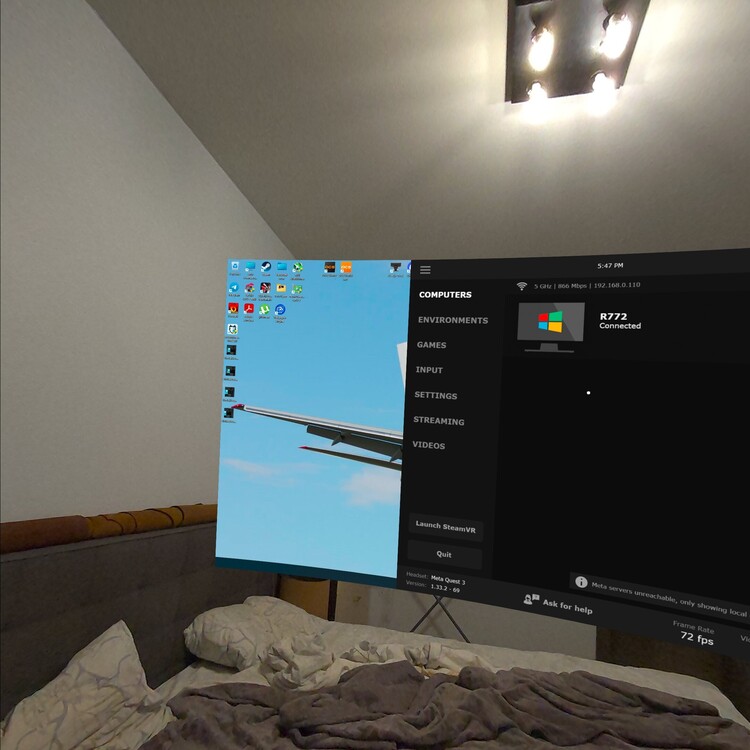 На данный момент удалось следующее: подключить Q3 к ПК по Steam Link, Quest Link, Air Link. При чём через VCOM и Steam Link запускается и прекрасно работает Steam VR и Half Live Alyx. ..... Весь затык с VD/// Шлем не видит ПК, всё ПО куплено, версии одинаковые... Но подключения не ни по WiFi nor VCOM. Сломал всю голову.