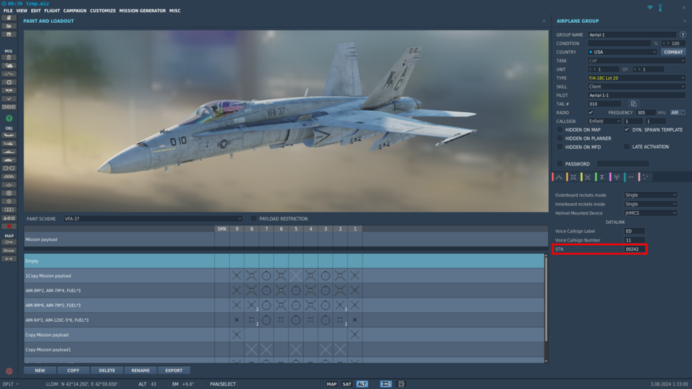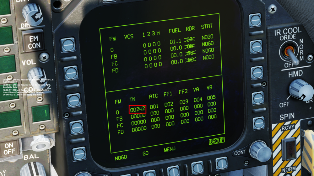 Screenshots 3 & 4 were taken within a couple of seconds of one another. Screenshot 3 shows the two targets after they had both become track targets, and I 'TMS Right' multiple times to promote them to system tracks, then set the further one as the bugged target. As before, I then pressed 'Transmit Switch - IFF OUT' and took screenshot 2, which appears to show both of the targets from screenshot 1 as track targets. The bugged target does have the ring around it though, as expected.