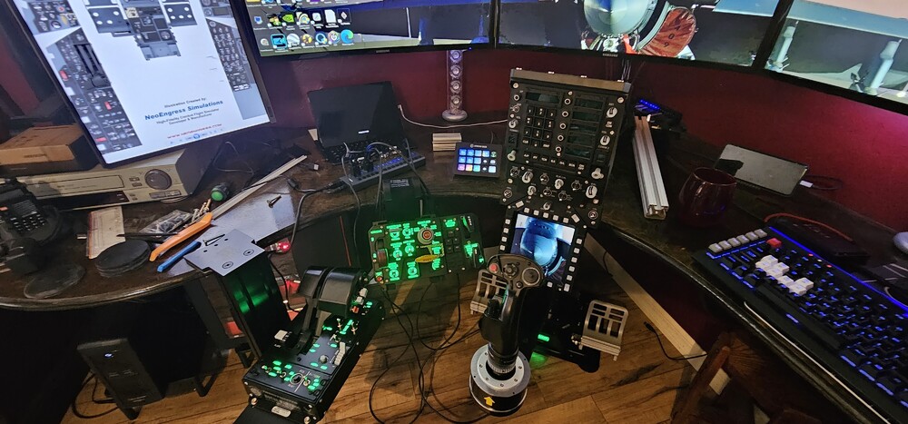 So, I was hoping to have everything set up to fly yesterday, but I am at the mercy of Amazon and waiting on parts to finish the build. Some of what you see is temporary just for fitment and trying to figure out what needs to go where. And yes, there is a LOT of cable management to be done. First thoughts on the Winwing equipment... the build quality is great, the software is a little bit of a struggle but it is not to hard to work through. I was very happy to see that they are paying attention to community reviews... all the gripes with the PTO2 seem to have been adressed (wing fold lever loose etc.) and I am totally staisfied with the panel. It is only a place holder for the Deskpit and will not see it's way to the official pit project. And a huge shout out to @LooseCannon for my Warthog Panel! https://forum.dcs.world/topic/275207-custom-warthog-throttle-faceplate/page/2/#comment-5289570 So, the UFC, center DDI, PTO2, and pedals are in place... it's a little cluttered, but it works for testing. I still have a lot ot garage clean up to do before I can pull the real pit down from the attic... but hopefully soon...