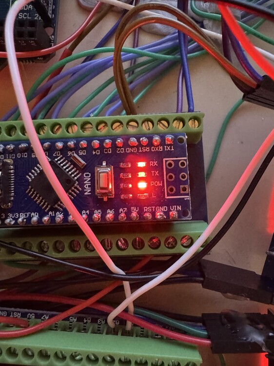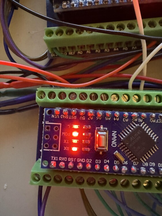 Okay so got it running on the skunkworks fork. COM 4 connected with my Mega as master on the same setup as before. Same lights... Master: L and RX when the is game unpaused Slave 1: RX and POW bright TX dim. Slave 2: POW and RX bright TX dim. L is also lit on SLV 2 but I think that's to do with the rot encoder on pin 13 as it flashes when turning although I have it set to input in setup... I can see the bits or whatever flashing by on the cmd prompt window for "connect-serial-port.cmd" and if I use the bridge helper I can see the write mb ticking up but the read is blank. I am guessing the write is writing to the Arduino as the RX LED is flashing on the master. I will check tomorrow with my multimeter (I left it at work) to ensure I have a connection for every pin from the headers to the breakout, then the breakout to the bus bars, and then the bus bars to the components. I will also double-check all grounding and power although I feel it wouldn't start if there were a power or grounding issue. I know for certain the 3 pos switches and rotaries are functioning. I tested them before it was all assembled. I tried disconnecting all the RS485 and common GND/5V and tried an IRQSerial style sketch on both Slave 1 and Slave 2 with nothing to show for it. Feels like 1 step forward two steps back. Hopefully, the wiring checks out and I don't have to re-solder a tone of Diodes! One thing I am uncertain on and may seem an obvious blunder; I currently have the a and b lines spliced together so they basically form a triangle of cables with female duponts at each end connecting to the a and b pins on the MAX485s. Should I instead have it set up like this: MAX485_1 A PIN--->MAX485_2 A PIN then MAX485_2 A SCREW TERMINAL ---> MAX485_3 A SCREW TERMINAL? In my head, I can't see why as it looks like it is just a direct connection on the PCB from the pin to the terminal so there is nothing happening in between. And like a CANBUS it's using differential signalling so it shouldn't matter "where" the board is it just needs to send the right bits. Correct?
