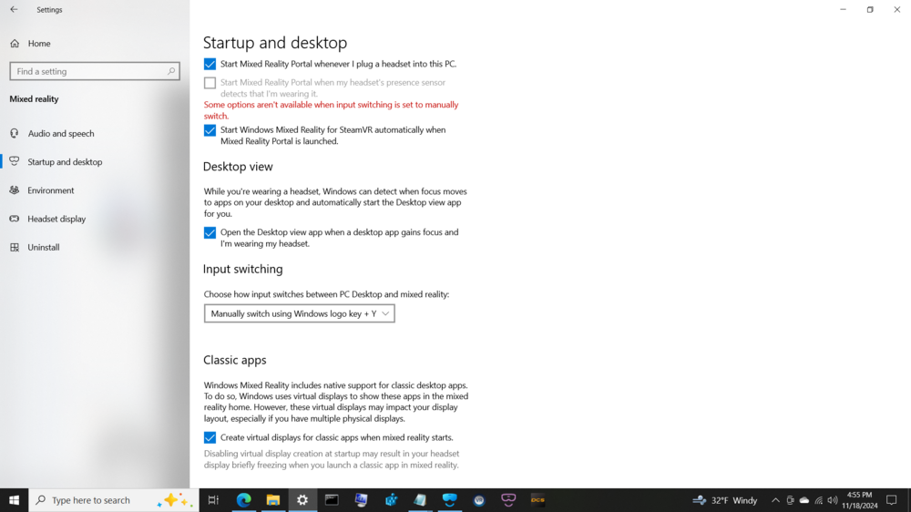 Yes, Steam VR launches automatically. In WMR, there is no launch button I can find. (same with Open XR tools) Now, with SteamVR running it shows my games in the panel. I can start DCS from there, and in 2D I can select the VR button next to lauch DCS, I get the next panel (15 years of DCS) In 3D, there is nothing to show, even with the monitor button off. Ta the point where DCS is launched, (the row of games at the bottom,) DCS shuts down completely. So, someone need to clu me in how to launch DCS from mixed reality. If only DCS would launch the same as Google EarthVR and Oculus, I would be good to go. dcs.log