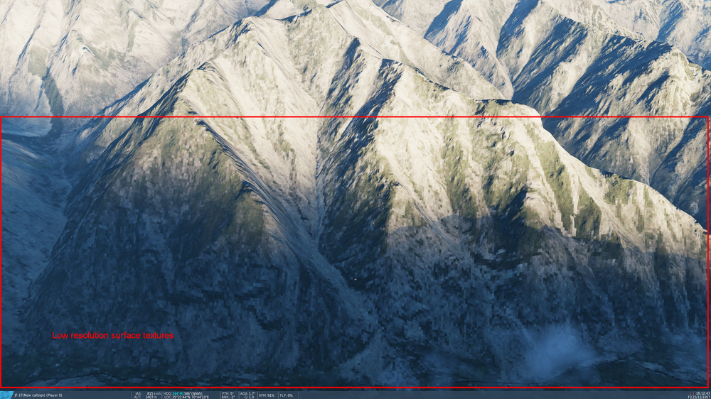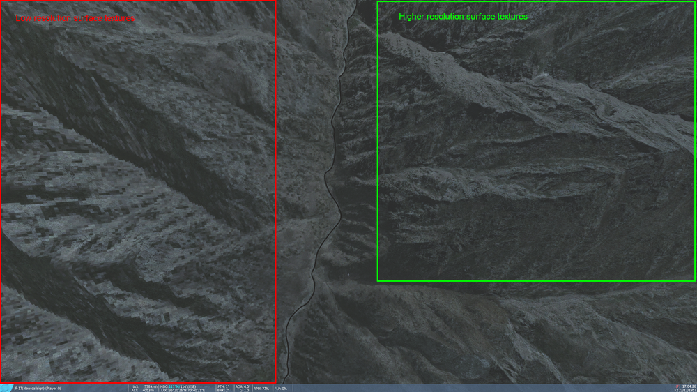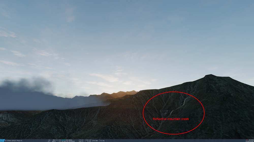 This may be part of the upcoming North Afghanistan map, however I want to report this anyway as it also affects the East Afghanistan map. In the current DCS release 2.9.13.6818, sector XE in the northeastern part of the Afghanistan terrain exhibits low resolution, checkerboard-like surface textures throughout a substantial part of the mountain area (you may have to zoom the screenshots to 100% to view the issue): On the mission editor map, the difference in texture resolution can easily be viewed by switching to satellite imagery and zooming in until the map scale indicator shows 600 m or below. Furthermore, creeks rendered as water on mountainsides can become unnaturally "shiny" under certain lighting conditions - even when in the shadow of the mountain - as their surface reflects the sky colors. This may affect all creeks on mountainsides throughout the map: Also, as already has been reported by others, there seem to be base mesh / altitude issues with rivers throughout sector XE and possibly adjacent sectors. Apart from the above, the ambience and feel of the terrain is awesome and a joy to fly in. Keeping my fingers crossed that you will bring the quality of the entire mountain area east and northeast of Kabul and Jalalabad right up to the Chinese border up to par, as this area offers spectacular high-altitude mountain terrain truly unique among the available DCS maps. Thank you for keeping up the great work!