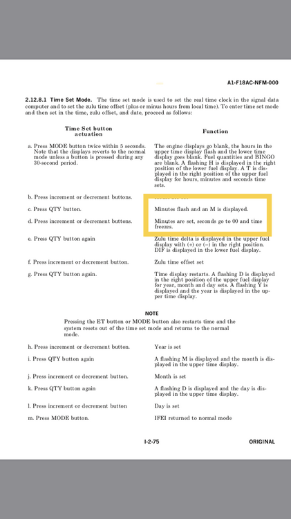 I was talking to a naval aviator buddy and he mentioned that the carrier will give out a time hack during case III operations. I know our planes are always hacked because it’s a sim, but I figured I’d see if I could figure out how it would be done IRL. I started digging in the natops and found this(see below) The issue is when I select the minutes the natops says the seconds zero out (they do) and time freezes, but the seconds in the hud keep ticking away, and when I exit time set mode the seconds continue as if they were never zeroed. I could be doing something wrong. Just thought I would mention just in case it is accually wrong and maybe you could squeeze it in between the way more important stuff. Thanks.