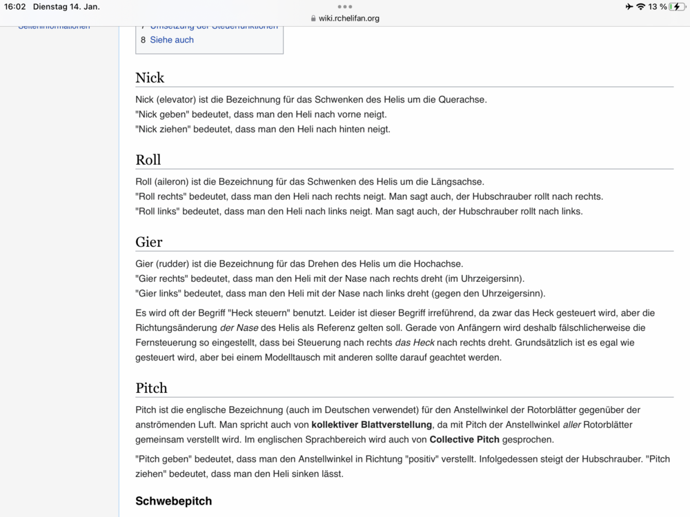 2. Teste ich heute Abend mal und berichte dann! Im echten Hubschrauber Bereich sowie im RC Hubschrauber sagt man eigentlich nur Nick Roll Gier und Pitch, aber du hast Recht, ist ja eigentlich Englisch und Deutsch gemischt, hat sich vielleicht so eingespielt. Hier mal ein Auszug aus der Wiki: