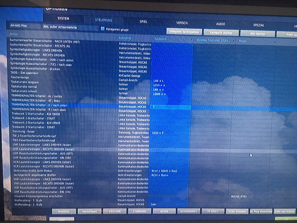 1. Also der viereckige schwarze Trimmschalter links am Steuerknüppel des Apache bewegt sich wenn ich an der Tastatur T drücke. In den Einstellungen springt der Curser auf T und die Tastatur wird blau, siehe Foto. Einen kurzen Flug habe ich aufgenommen und abgespeichert, aber im Ordner DCS ist kein Ordner mit Tracks!?