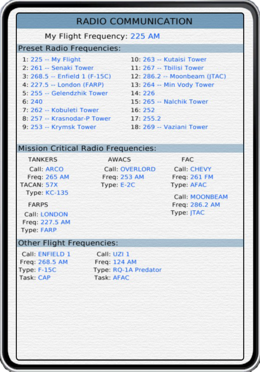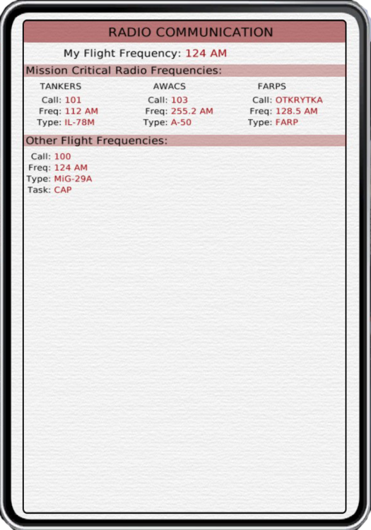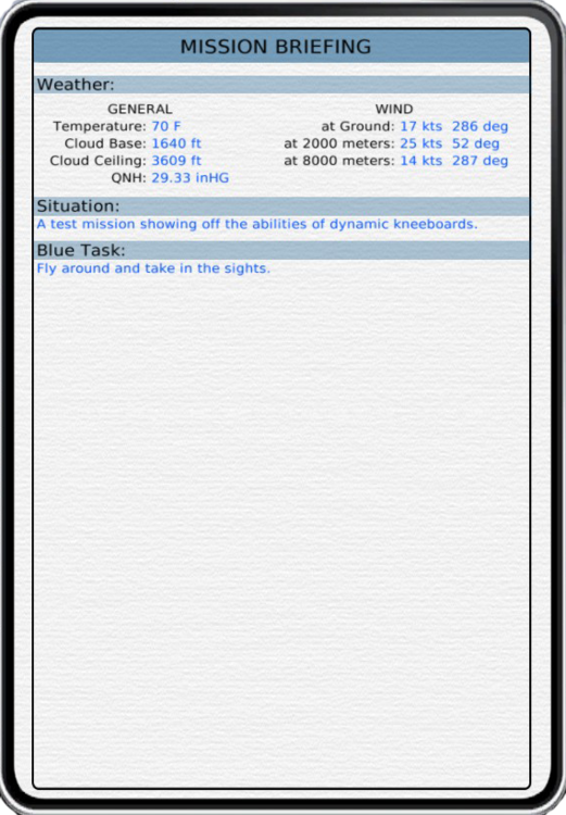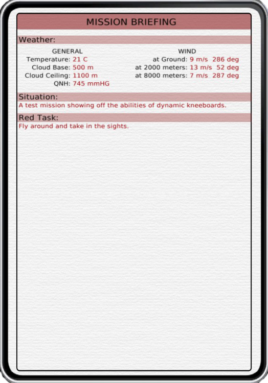 Version 1.6.1.0 Released Version 1.6.1.0 is now available. VERSION 1.6.1.0 CHANGELOG: -dynamic kneeboard now has full functionality in Multiplayer -split mission briefing dynamic kneeboard into two pages to allow for longer situation and task briefings -split mission radios dynamic kneeboard into two pages to allow for more other flight frequencies -fixed issue of FARP frequencies not appearing in mission radios dynamic kneeboard -added navigation beacons dynamic kneeboard (three pages) -other minor bug fixes