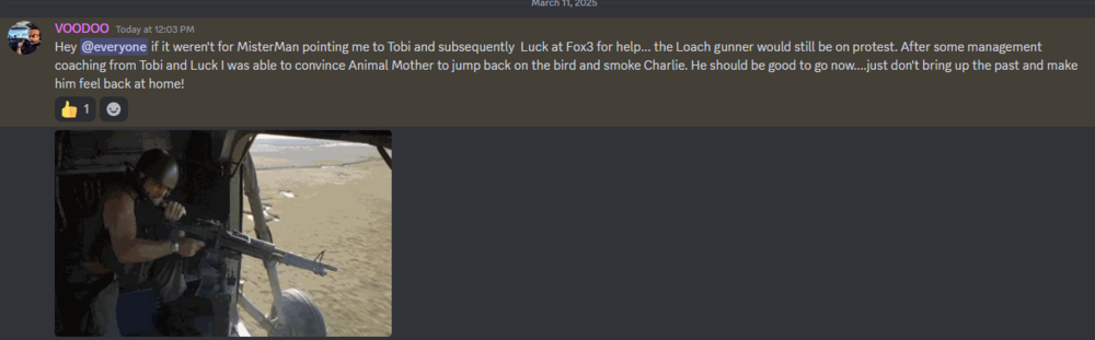 @HawaiianRyan I totally agree with you on the "Realism-Minded Community" comment as that was my original intention. Because the server, and discord are still somewhat in it's infancy, with so many joining up on a daily basis, it's kind of necessitated Discord comms to welcome and situate new comers. As the regulars, ethics and unwritten rules begin to develop, SRS will undoubtedly become the defacto communication method for those seeking that sense of Realism. I've already taken some preemptive steps to encourage the use of SRS by creating a VC that indicate to others that they're "down range and on SRS". Like @Mistermann said, Because this is pulling quite a bit of people out of SP and into MP, it's possible that they haven't even experienced SRS yet. So in addition to encouraging people to use it, we also have to coach them on how. If I could have it my way, I would mandate SRS...but I can't. We can only lead by example and encourage others to follow along. If it weren't for the wizard himself ( @tobi ) the Loach gunner would still be on protest. -