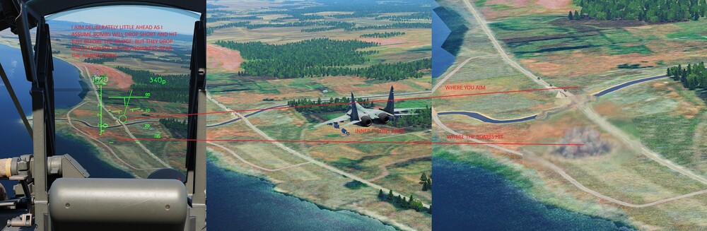 Nah, thats not it, not in the quick mission I tried this and where track is from, anyway... the targets are on coastline flat area so maybe few m difference at most, which should not be the cause of it. My guess is, looking at that screenshot of HUD, that aiming reticle and line are shifted above horizont line, I think the top of the line should be level with aircraft line, not anove it, and if you shift that line down to the aircraft line on the HUD the aiming circle comes right above the area where the bombs actually hit. EDIT: ignore the crossed out part, I realised what I wrote and thought was the issue, makes no sense so just ignore it Yes, good point