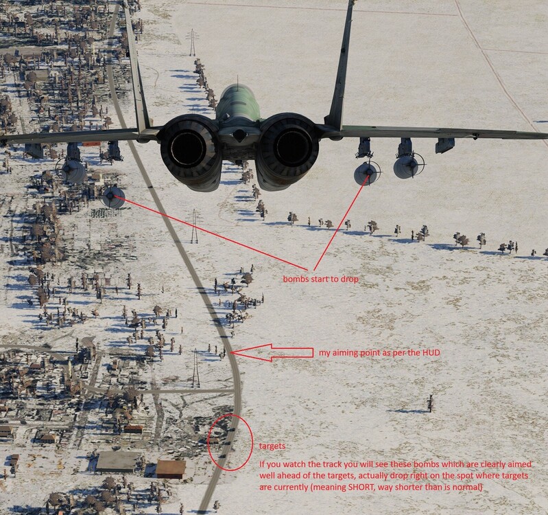 Beside the cannon on the MIG-29A Fulcrum module being bad I can see that deployment of bombs (all kinds) is extremely bad as well, I have tried RBK, KMGU, FAB & ODAB (or maybe the last one has a different name, I can't remember now but its not relevant to this issue) and all of them drop way too short of the aiming point on the HUD... I mean all of them, all the time. I thought maybe its the map issue somehow (maybe terrain elevation is off on some maps) so I tried Caucuses map also and I can see the same thing. FAB500 deployment.trk