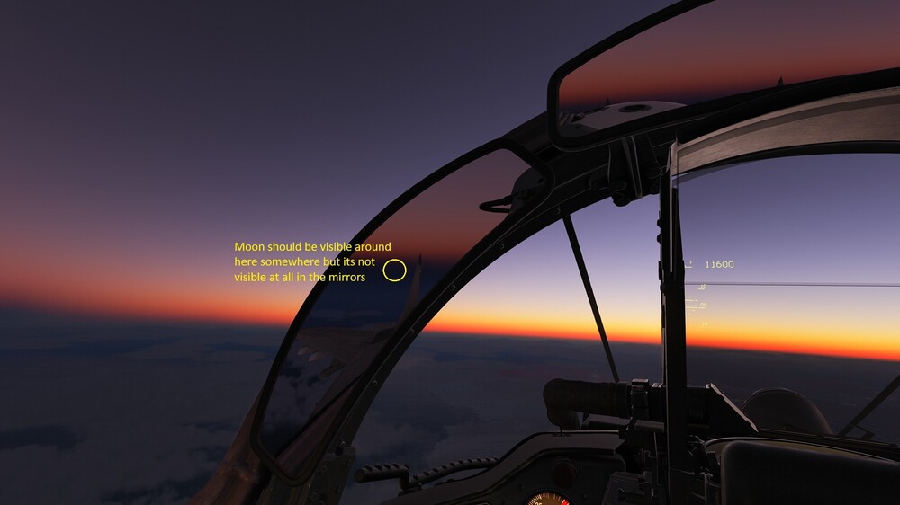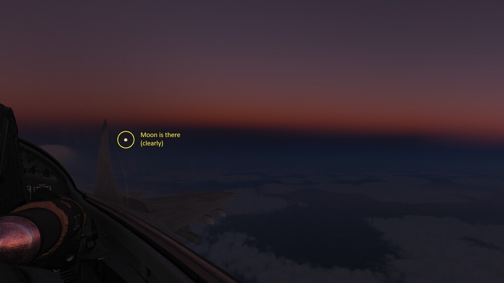 Not sure if this is for MiG-29 Fulcrum module only (haven't checked any other aircraft as I now fly MiG-29 Fulcrum module only) so what I can say is that the Moon is not visible at all in the mirror(s) of MiG-29 Fulcrum module at all see screenshots On similar topic, there is another bug for MiG-29 Fulcrum mirrors in that the clouds rendered at longer distances have very pixelated edges) whereas clouds near look normal/good (the sun also looks very "blocky" in the mirrors in case no one else noticed)