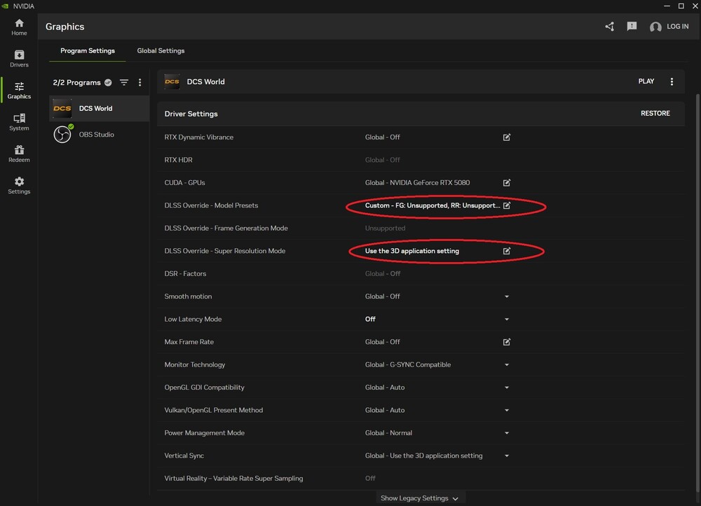 My Meta Quest 3 is far from that. The resolution is 1.5 in DCS. Still, there should be some improvement, right? I followed your instructions. Is that no longer necessary? Is it now sufficient to set the “DLSS Override – Model Preset” option to “Latest” in the Nvidia app and activate DLSS in DCS? I use a RTX 5080. In 2D, the following appears: