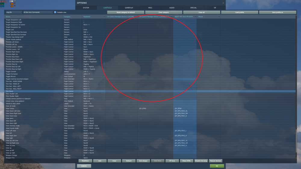 Been struggling to get commands bound to my HOTAS. I can assign axis ok but keys will not assign to all of the commands. Some will allow me to change but others are "greyed out" and wont allow to be reassigned. See pic. I've tried a repair, tried deleting save file, tried Virpil stick by its self, tried deleting lua files, tried searching posts but could not find answer. Clean install. The simplest command to my virpil stick for trim commands wont work. Thanks in advanced. Red circled commands are some but not all of the commands that wont allow me to remap.