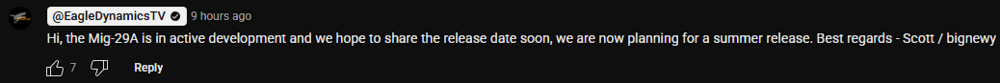 Well, I think the MiG-29 project is a little different from those, as we already have the FC3 version. Anyways, we got further confirmation from ED a couple of hours ago, confirming about the summer release (around 60-75 days) of the Mig-29 mentioning specifically this summer, less than 9 hours ago and again with such little time as summer is already starting, means they are very confident to have release in this summer. I attached the comment so you can see it yourself.