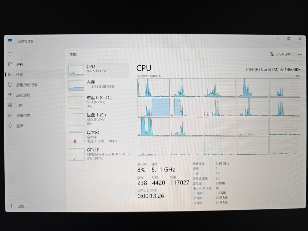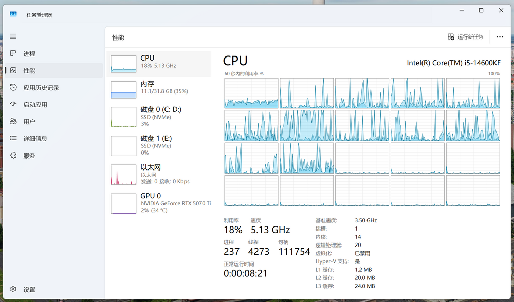 In fact, just as I described in the third point, the frame rate issue caused by mouse movement is quite strange. Sometimes it doesn't occur when I launch the game, and sometimes it does, and I can't find a pattern to it. I tried lowering the polling rate to 500, but the problem didn't go away and still maintained the aforementioned odd characteristics. However, there's one thing I think is worth noting: when this issue occurs, the CPU performance graph is similar to the second and third graphs on the second floor. What's more, when I move the mouse quickly, I can see the occupancy rate of one of the cores shoot up to 100% in no time. When the issue doesn't occur, the CPU performance is close to what's shown in the first graph, and there's no obvious or sharp change in the CPU performance graph when I move the mouse quickly.