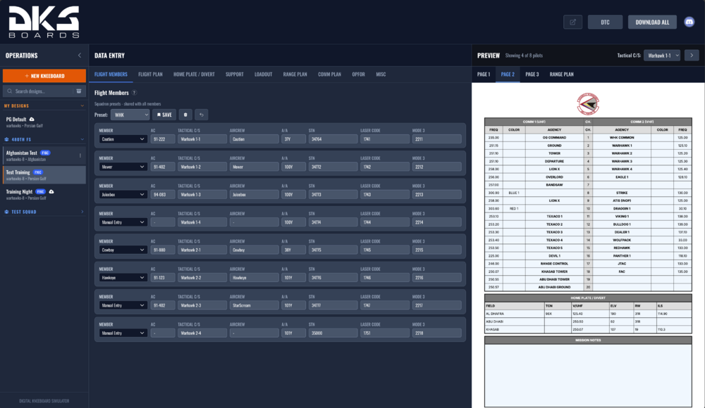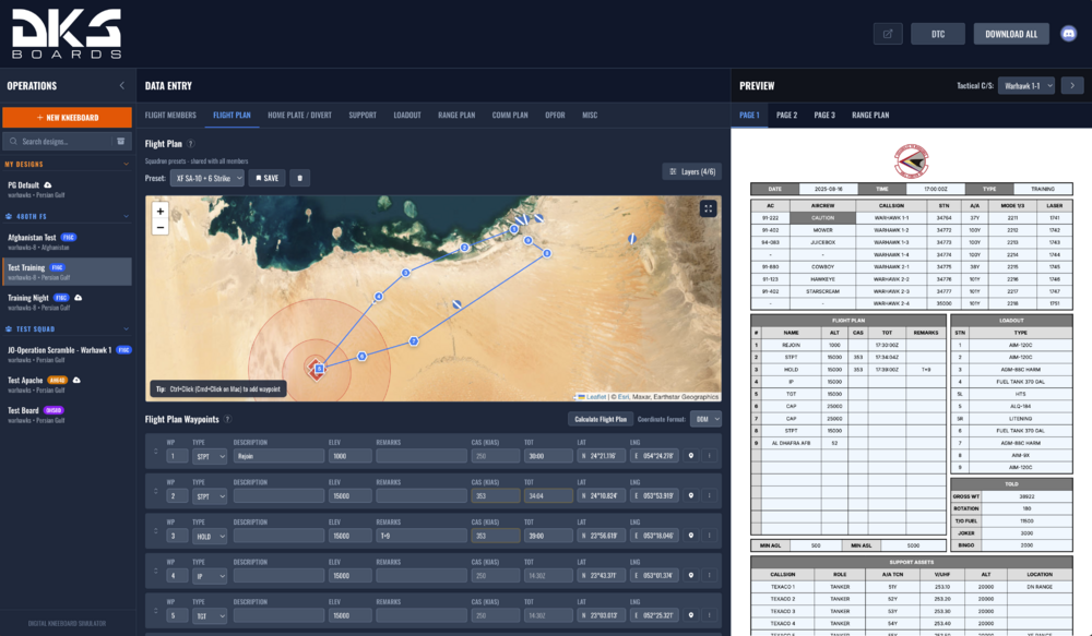 For the past couple months I've been working on a utility to help people create kneeboards/mission cards for flight nights with their squadrons/friends. I call it Digital Kneeboard Simulator. While its still a ways out from what I would consider fully feature complete it has quite a few features that I think make it compelling. No install required, is entirely a totally free webapp Miz file import with corresponding import of both flight and redfor elements. Full mission planning feature set Interactive waypoint editing Per member loadout support with exports to DCS Preset creation for mission card segments for rapid mission creation Supports all theaters (that I know of) All airbases listed and displayed on maps Easily snap waypoints to airbases Automatically calculates elevation for any point and snaps waypoints to ground if desired DCS-DTC export Loadout weight calculation with automatic rotation speed calculation Flight time and ToT calcualtions with automatic CAS calculations for interstitial waypoints Parameterized popup attack calculator Many templates with more coming Ability to publish kneeboards and share a public link to in discord for easy disemination to your squad Single click setup script included in exports Installable by hand if setup script is too scary Squadron system to allow co-operative mission creation and planning Supported airframes: F-16 (Stable) Kiowa (Stable) Apache (Stable) F-18 (Beta) A10CII (Alpha) Coming in the future Support for blufor import form a miz file Native DCS DTC file support (instead of the DCS-DTC external app, which is quite excellent) More attack profiles Note that this is not a utility to make a miz file. Instead this should be thought of as a utility to create mission cards for an existing miz file or create mission cards for squadrons that reqularly fly on servers with dynamic ranges. Screenshots: