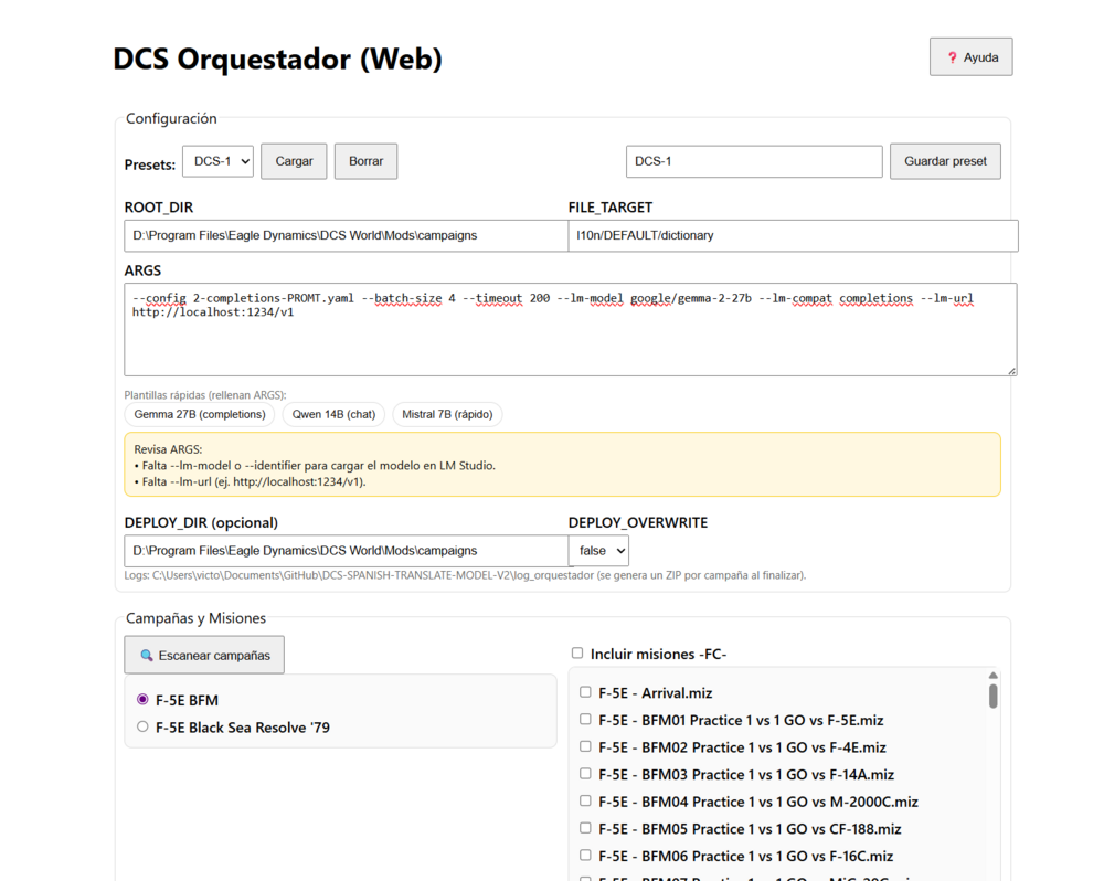 Subiré el proyecto a Github, para que se entienda mejor lo que quiero hacer y por si alguien lo quiero probar, ya pondré el link en unos días. Pero el quid de la cuestión es lanzar las traducciones contra un modelo entrenado para DCS, es ahí donde necesito colaboración, ya que solo dispongo de una campaña en ingles. slds. -