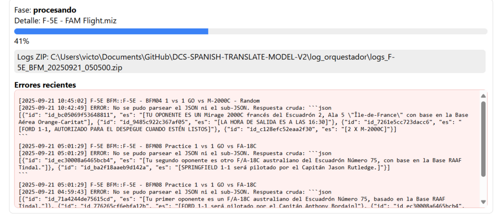 2.0 UPDATE Publico nueva versión de la herramienta y nuevo hilo en el foro: slds. ----------------------------------------------------------- MENSAJE ORIGINAL Buenas noches, en primer lugar me presento, mi nombre es Víctor y hace poco que me he aficionado a este simulador y unido a este foro. Hace poco que he empezado a aprender como funciona mi primer modulo (F5-E) y me he encontrado con que el módulo de mi primera campaña "Black Sea Resolve 79's", está toda en inglés y a veces no me siento cómodo ya que no me entero de que está pasando. De ahí me propuse crear una herramienta que mediante un modelo de IA, traduzca y vuelva a empaquetar las misiones de la campaña, de momento solo el texto, comunicaciones por radio, briefings, etc. Esa parte ya la tengo hecha y tengo una herramienta que puede trabajar con modelos públicos usando su API (solo he probado DeepSeek) con buenos resultados, a un coste de 35 céntimos las 25 misiones de la campaña que poseo y tardando unas horitas.... Pero como no estaba del todo contento con la traducción ni con el tiempo que se tarda siendo el proceso totalmente automático, quiero hacer "fine tunning" a un modelo local (funciona mucho mas rápido y se le puede entrenar, los resultado son espectaculares y en un minuto tienes una misión traducida y re-empaquetada) pero necesito muchas muestras de texto en inglés para traducirlas y entrenar al modelo. De esa manera puedo crear mi propio modelo especializado en traducción de DCS al Español, con un contexto claro y que no suenen raro algunas frases. Y aquí está el tema, como no puedo comprar todos los módulos de DCS, necesito colaboradores, a cambio les traduciría las misiones y cuando tuviera el modelo entrenado lo publicaría para que cualquiera pudiera usarlo junto con la herramienta, que no es mas que un script que se puede ejecutar en cualquier PC con un procedimiento al alcance de cualquiera. Si la cosa sale bien lo siguiente sería crear otra herramienta para traducir también las voces, aunque es algo mucho mas ambicioso. Espero que hay alguien interesado en este proyecto y me eche una mano pero también quiero comentar, que solo voy a aceptar a los primeros que quiera colaborar con sus misiones (.miz), ya que con una sola muestra es suficiente. El resto tendrá que esperar a que se publique la herramienta. Y todo esto aclarando que no se si es del todo legal lo que propongo y si la compañía DCS podría tener alguna pega. ¡¡A ver si alguien puede darme alguna indicación para este punto LEGAL antes de comenzar a publicar nada!! Saludos y buen vuelo.