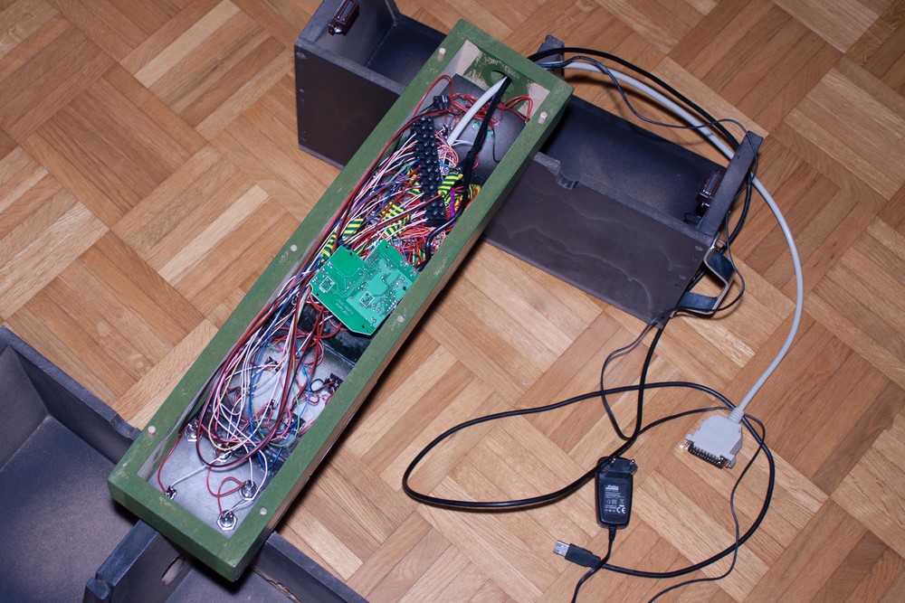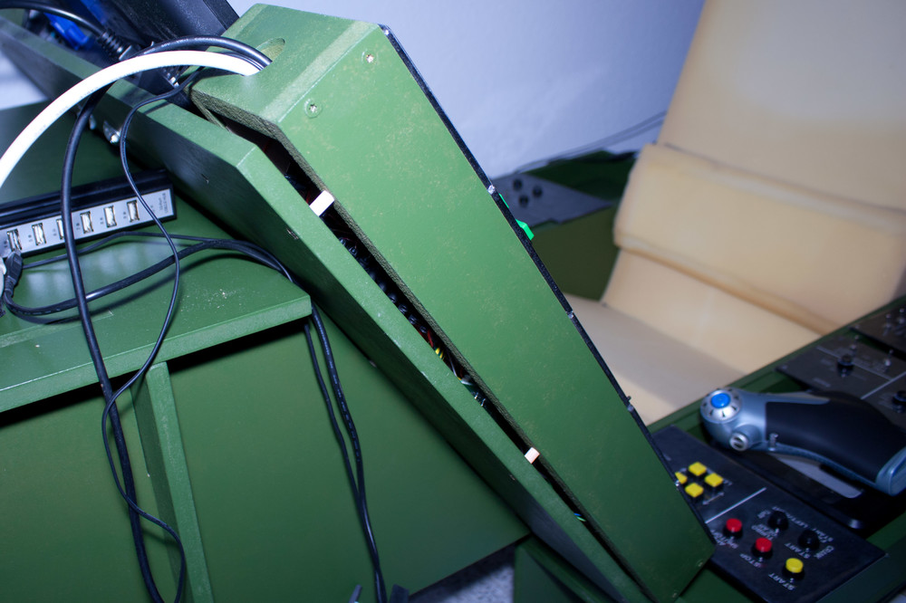 So, von mir gibts mittlerweile auch etwas Neues. Ich habe die erste Seitenkonsole fertig. Das ganze ist ja so gedacht, das ich die einzelnen Konsolen austauschen kann, wenn ich etwas verändern möchte, oder gar ein ganz anderes Fluggerät fliegen will. Auf den ersten beiden Bildern sieht man die Konsole von vorne, mit den einzelnen Panels und von hinten mit dem ganzen Gewirr an Kabeln. Ich habe zum einen die Platinen eines alten Joysticks verwendet um die Taster anzuschließen. Zum anderen werden die Restliche Taster/Schalter sowie die LED´s mit dem 25 Poligen SUB-D-Kabel an die Arcaze-Karte angeschlossen. Durch den Stecker kann ich das ganze schnell lösen und austauschen. Auf dem Dritten Bild kann man erkennen, wie die Konsole durch einfache Holzdübel auf dem Akers-Barnes-Cockpit aufgesteckt werden. Das ganze ist also sehr flexibel gehalten.