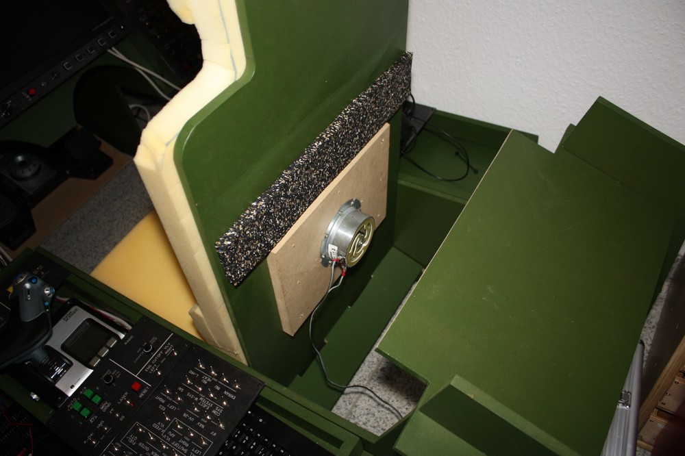 zum Sitzbezug hat´s noch nicht gereicht, aber ich hab mein Pit trotzdem noch etwas ausgebaut. Mit Hilfe eines alten Dolby-Souround-Verstärkers, einer Frequenzweiche und 2 Bassshakern hab ich etwas "Bewegung" in mein Pit gebracht. Dazu habe ich je einen Bassshacker an der Rückenlehne und einen unter dem Sitz angebracht. Den Sitz habe ich dann mit Hilfe einer vibrations-dämpfenden Matte (so eine, die man z.B. unter die Waschmaschine legt) vom Rest des Pits "entkoppelt", damit meine Nachbarn unter mir nicht jedes mal mitbekommen, wenn ich starte. Je nach Lautstärke bekomme ich jetzt mehr oder weniger den Poppes und den Rücken massiert. Das Starten der Motoren (wenn die Rotoren anfangen sich zu drehen), das Feuern mit der Bordkanone und nahe Explosionen bekommen ein ganz neues Feeling. Die Shaker wandeln die Tiefen Töne (jeh nach Einstellung der Frequenzweiche bis maximal 120 Hz) in Vibrationen um, die Durch die Rückenlehne und Sitzfläche auf den Körper übertragen werden. Alles in Allem hat das ganze keine 30 Euro gekostet und war den Aufwand auf jeden Fall wert.