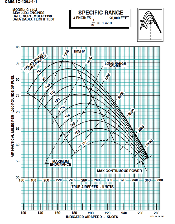 Правильно ли я понимаю из этой таблички, что на высоте 20 000 футов C-130J весом 100 000 фунтов, удерживая IAS = 178 KNOTS пролетит на тысяче фунтов топлива 81 морскую милю, и это будет самым экономичным режимом полёта на такой высоте? https://www.docdroid.com/pDQh0cn/italian-c-130j-performance-manual-pdf#page=196