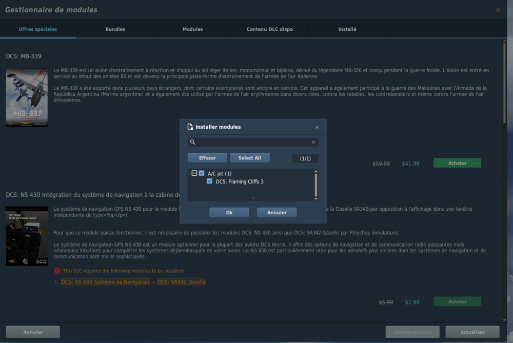 same problèm, update FC3 2024 doesnt want to be installed, seem updater launched but nothing to install, my dcs is not steam, but seem confuse with my old installation steam i clean and remove my old install dcs steam, it doesn't see anymore but same problem, i saw nothing to install, and propose again the installation module FC3 2024 in dcs updater 00000.000 === Log opened UTC 2024-07-16 18:21:31 00000.052 INFO : DCS_Updater/2.16.2.17 (Windows NT 10.0.19045; Win64; fr-FR) 00000.053 INFO : src-id: 5972e82a1851d36865c17506579c27cbd5b8e3b4, lib-id: b88ea51ae2210987a3865f77cc1802548216d7a8 00000.053 INFO : cmdline: "E:\Program Files\Eagle Dynamics\DCS World\bin\dcs_updater.exe" apply 3edfc178-11b8-4c3b-8f48-f23f96d16f18 13628 00000.137 STATUS: Initializing... 00000.261 INFO : basedir: E:\Program Files\Eagle Dynamics\DCS World 00000.265 INFO : Command: install FC3 00000.266 INFO : DCS/2.9.6.57650 (x86_64; FR; WORLD,AERGES_MIRAGE-F1,AH-64D,MOSQUITO-FBMKVI,MI-24P,A-10C_2,P47D30,SUPERCARRIER,F-16C,FW-190A8,OCTOPUSG_I-16,RAZBAM_MIG19P,MAGNITUDE3_CHRISTEN_EAGLE-II,HEATBLUR_F-14,YAK-52,FA-18C,RAZBAM_AV8BNA,WWII-ARMOUR,AJS37,SPITFIRE-MKIX,F-5E,POLYCHOPSIM_SA342,RAZBAM_M-2000C,L-39,AVIODEV_C-101,MIG-15BIS,MIG-21BIS,BF-109K4,F-86F,FW-190D9,MI-8MTV2,UH-1H,CA,P-51D,KA-50,A-10C,MARIANAISLANDS_terrain,SYRIA_terrain,PERSIANGULF_terrain,NORMANDY_terrain,NEVADA_terrain,DEKA_JF-17,KA-50_3,CAUCASUS_terrain,RAZBAM_F-15E,F-86F_FC,F-5E_FC,MIG-15BIS_FC,HEATBLUR_F-4E,A-10A,SU-25A,F-15C,MIG-29,SU-27,SU-33) 00000.266 INFO : branch: 00000.268 STATUS: Downloading version info... 00001.820 INFO : install: Renamed FC3 into A-10A, SU-25A, F-15C, MIG-29, SU-27, SU-33 00002.265 STATUS: Préparation de l'installation A-10A,SU-25A,F-15C,MIG-29,SU-27,SU-33 ... 00002.316 STATUS: Verifying installed files... 00002.387 INFO : 0 files are changed or missing. 00002.412 STATUS: Verifying installed files... 00002.484 INFO : 0 files are changed or missing. 00002.509 STATUS: Verifying installed files... 00002.588 INFO : 0 files are changed or missing. 00002.615 STATUS: Verifying installed files... 00002.704 INFO : 0 files are changed or missing. 00002.736 STATUS: Verifying installed files... 00002.825 INFO : 0 files are changed or missing. 00002.854 STATUS: Verifying installed files... 00002.921 INFO : 0 files are changed or missing. 00002.933 STATUS: Preparing download... 00002.936 STATUS: Checking downloads... 00002.939 STATUS: Scanning existing files... 00002.940 INFO : To download: 0 bytes in 0 files 00002.941 STATUS: Searching for local copies... 00002.942 INFO : Found 0 local source(s). 00002.942 INFO : To download: 0 bytes in 0 files 00002.943 INFO : Removed 0 files. 00003.062 INFO : Kept 1157 files. 00003.062 INFO : Nothing to install. 00003.321 STATUS: Cleaning up... 00006.768 === Log closed. Good, for the moment i suspend my order for other product, oh58, kola, etc.. until this issue is fixed after installation, the update FC3 2024 is always here expecting after update https://www.digitalcombatsimulator.com/fr/shop/bundles/flaming_cliffs_2024/ Existing Flaming Cliffs Aircraft: F-15C A-10A Su-27 J-11 Su-33 Su-25 MiG-29 MiG-29S New Flaming Cliffs Aircraft: F-5E FC F-86F FC MiG-15bis FC edit : my FC3 is disable and i doesnt have J-11 (issue on it ?), and su33 old licence duplicate with new licence fc3 airplane seem update but not fC3 him self DCS: Flaming Cliffs 3 02.05.2017 Distributeurs A-10A Flaming Cliffs 14.07.2024 DCS E-Shop 2088692 14.07.2024 F-15C Flaming Cliffs 14.07.2024 DCS E-Shop 2088692 14.07.2024 F-5E Flaming Cliffs 14.07.2024 DCS E-Shop 2088692 14.07.2024 F-86F Flaming Cliffs 14.07.2024 DCS E-Shop 2088692 14.07.2024 MiG-15bis Flaming Cliffs 14.07.2024 DCS E-Shop 2088692 14.07.2024 MiG-29 Flaming Cliffs 14.07.2024 DCS E-Shop 2088692 14.07.2024 Su-25 Flaming Cliffs 14.07.2024 DCS E-Shop 2088692 14.07.2024 Su-27 Flaming Cliffs 14.07.2024 DCS E-Shop 2088692 14.07.2024 Su-33 Flaming Cliffs 23.02.2020 DCS E-Shop 887573 23.02.2020 Su-33 Flaming Cliffs 14.07.2024 DCS E-Shop 2088692 14.07.2024 -