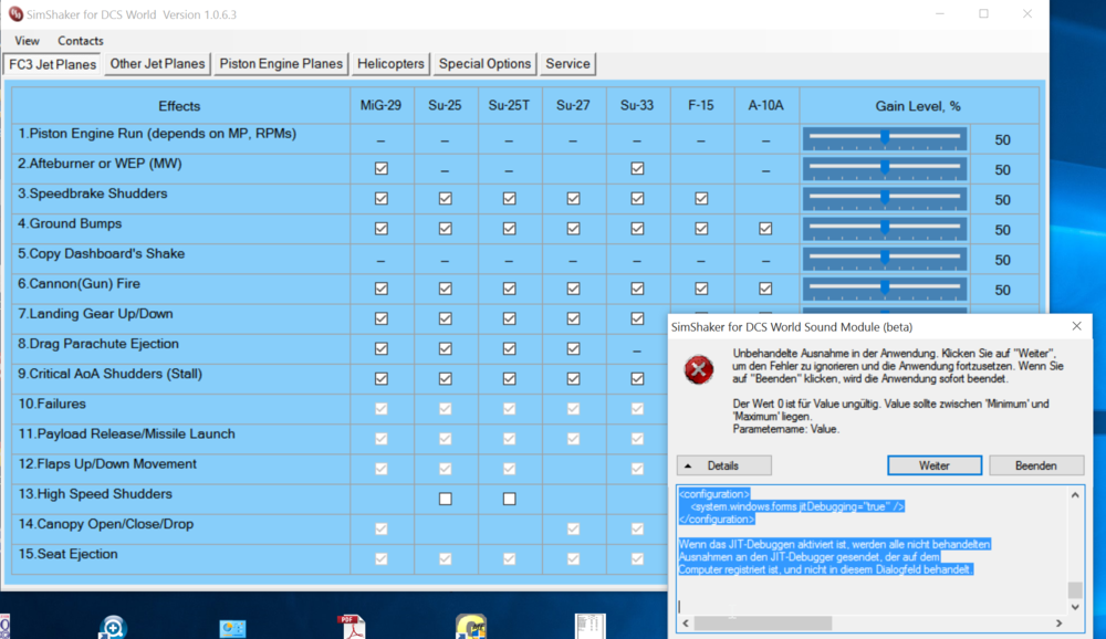Sure Informationen über das Aufrufen von JIT-Debuggen anstelle dieses Dialogfelds finden Sie am Ende dieser Meldung. ************** Ausnahmetext ************** System.ArgumentOutOfRangeException: Der Wert 0 ist für Value ungültig. Value sollte zwischen 'Minimum' und 'Maximum' liegen. Parametername: Value bei System.Windows.Forms.NumericUpDown.set_Value(Decimal value) bei *************.********(NumericUpDown , Decimal ) bei *************.********(Object , EventArgs ) bei System.Windows.Forms.Form.OnLoad(EventArgs e) bei System.Windows.Forms.Form.OnCreateControl() bei System.Windows.Forms.Control.CreateControl(Boolean fIgnoreVisible) bei System.Windows.Forms.Control.CreateControl() bei System.Windows.Forms.Control.WmShowWindow(Message& m) bei System.Windows.Forms.Control.WndProc(Message& m) bei System.Windows.Forms.ScrollableControl.WndProc(Message& m) bei System.Windows.Forms.ContainerControl.WndProc(Message& m) bei System.Windows.Forms.Form.WmShowWindow(Message& m) bei System.Windows.Forms.Form.WndProc(Message& m) bei System.Windows.Forms.Control.ControlNativeWindow.OnMessage(Message& m) bei System.Windows.Forms.Control.ControlNativeWindow.WndProc(Message& m) bei System.Windows.Forms.NativeWindow.Callback(IntPtr hWnd, Int32 msg, IntPtr wparam, IntPtr lparam) ************** Geladene Assemblys ************** mscorlib Assembly-Version: 4.0.0.0. Win32-Version: 4.6.79.0 built by: NETFXREL2. CodeBase: file:///C:/Windows/Microsoft.NET/Framework/v4.0.30319/mscorlib.dll. ---------------------------------------- SoundModule Assembly-Version: 1.0.0.17. Win32-Version: 1.0.0.17. CodeBase: file:///C:/Users/manu/AppData/Local/Apps/2.0/2WEJB0Y2.D20/NPQ7O8D8.2KX/ibae..tion_0000000000000000_0001.0000_04fe80b3a40b0cd7/DCS%20World/Sound%20Module/SoundModule.exe. ---------------------------------------- wtvDEhJGWRilmiGPjNzXfVQXeBx Assembly-Version: 0.0.0.0. Win32-Version: 1.0.0.17. CodeBase: file:///C:/Users/manu/AppData/Local/Apps/2.0/2WEJB0Y2.D20/NPQ7O8D8.2KX/ibae..tion_0000000000000000_0001.0000_04fe80b3a40b0cd7/DCS%20World/Sound%20Module/SoundModule.exe. ---------------------------------------- System.Windows.Forms Assembly-Version: 4.0.0.0. Win32-Version: 4.6.79.0 built by: NETFXREL2. CodeBase: file:///C:/WINDOWS/Microsoft.Net/assembly/GAC_MSIL/System.Windows.Forms/v4.0_4.0.0.0__b77a5c561934e089/System.Windows.Forms.dll. ---------------------------------------- System Assembly-Version: 4.0.0.0. Win32-Version: 4.6.79.0 built by: NETFXREL2. CodeBase: file:///C:/WINDOWS/Microsoft.Net/assembly/GAC_MSIL/System/v4.0_4.0.0.0__b77a5c561934e089/System.dll. ---------------------------------------- System.Drawing Assembly-Version: 4.0.0.0. Win32-Version: 4.6.79.0 built by: NETFXREL2. CodeBase: file:///C:/WINDOWS/Microsoft.Net/assembly/GAC_MSIL/System.Drawing/v4.0_4.0.0.0__b03f5f7f11d50a3a/System.Drawing.dll. ---------------------------------------- NAudio Assembly-Version: 1.7.3.0. Win32-Version: 1.7.3.0. CodeBase: file:///C:/Users/manu/AppData/Local/Apps/2.0/2WEJB0Y2.D20/NPQ7O8D8.2KX/ibae..tion_0000000000000000_0001.0000_04fe80b3a40b0cd7/DCS%20World/Sound%20Module/NAudio.DLL. ---------------------------------------- Accessibility Assembly-Version: 4.0.0.0. Win32-Version: 4.6.79.0 built by: NETFXREL2. CodeBase: file:///C:/WINDOWS/Microsoft.Net/assembly/GAC_MSIL/Accessibility/v4.0_4.0.0.0__b03f5f7f11d50a3a/Accessibility.dll. ---------------------------------------- System.Configuration Assembly-Version: 4.0.0.0. Win32-Version: 4.6.79.0 built by: NETFXREL2. CodeBase: file:///C:/WINDOWS/Microsoft.Net/assembly/GAC_MSIL/System.Configuration/v4.0_4.0.0.0__b03f5f7f11d50a3a/System.Configuration.dll. ---------------------------------------- System.Core Assembly-Version: 4.0.0.0. Win32-Version: 4.6.79.0 built by: NETFXREL2. CodeBase: file:///C:/WINDOWS/Microsoft.Net/assembly/GAC_MSIL/System.Core/v4.0_4.0.0.0__b77a5c561934e089/System.Core.dll. ---------------------------------------- System.Xml Assembly-Version: 4.0.0.0. Win32-Version: 4.6.79.0 built by: NETFXREL2. CodeBase: file:///C:/WINDOWS/Microsoft.Net/assembly/GAC_MSIL/System.Xml/v4.0_4.0.0.0__b77a5c561934e089/System.Xml.dll. ---------------------------------------- System.Xml.Linq Assembly-Version: 4.0.0.0. Win32-Version: 4.6.79.0 built by: NETFXREL2. CodeBase: file:///C:/WINDOWS/Microsoft.Net/assembly/GAC_MSIL/System.Xml.Linq/v4.0_4.0.0.0__b77a5c561934e089/System.Xml.Linq.dll. ---------------------------------------- System.Windows.Forms.resources Assembly-Version: 4.0.0.0. Win32-Version: 4.6.79.0 built by: NETFXREL2. CodeBase: file:///C:/WINDOWS/Microsoft.Net/assembly/GAC_MSIL/System.Windows.Forms.resources/v4.0_4.0.0.0_de_b77a5c561934e089/System.Windows.Forms.resources.dll. ---------------------------------------- mscorlib.resources Assembly-Version: 4.0.0.0. Win32-Version: 4.6.79.0 built by: NETFXREL2. CodeBase: file:///C:/WINDOWS/Microsoft.Net/assembly/GAC_MSIL/mscorlib.resources/v4.0_4.0.0.0_de_b77a5c561934e089/mscorlib.resources.dll. ---------------------------------------- ************** JIT-Debuggen ************** Um das JIT-Debuggen (Just-In-Time) zu aktivieren, muss in der Konfigurationsdatei der Anwendung oder des Computers (machine.config) der jitDebugging-Wert im Abschnitt system.windows.forms festgelegt werden. Die Anwendung muss mit aktiviertem Debuggen kompiliert werden. Zum Beispiel: <configuration> <system.windows.forms jitDebugging="true" /> </configuration> Wenn das JIT-Debuggen aktiviert ist, werden alle nicht behandelten Ausnahmen an den JIT-Debugger gesendet, der auf dem Computer registriert ist, und nicht in diesem Dialogfeld behandelt.