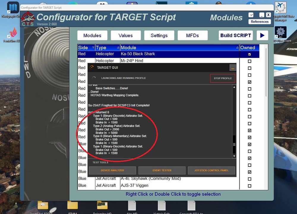 Hi there! I gave it another go, and I´ve spent some hours to set everything up (TrackIr, VAICOM, SRS, etc.). The voice says "SU25 selected" when I hit the play button in CTS. I´ve assigned the keyboard and Warthog in the controller setup in DCS in the corresponding columns, as described in the manual. The default WH assignments don´t show up, when the script is running. But I can´t select different profiles "on the fly" with HOTAS shift + speedbrake. If I hit this combination for a bit longer, it changes speedbrake behaviour (binary analogue, etc.). If I select the A10C profile as default at startup, everything seems to work fine at first, but then, all goes crazy. Like the coolie hat on the throttle. It doesn´t change MFDs and SOI, but activates switches and OSBs on the MFDs. What am I doing wrong here? Plus, I don´t understand the "CUSTOM INPUT DEFAULT LUA PROFILES (RECOMMENDED)" part. Is this optional, and what does it do? Here are some screenshots of the current state:- 2263 replies