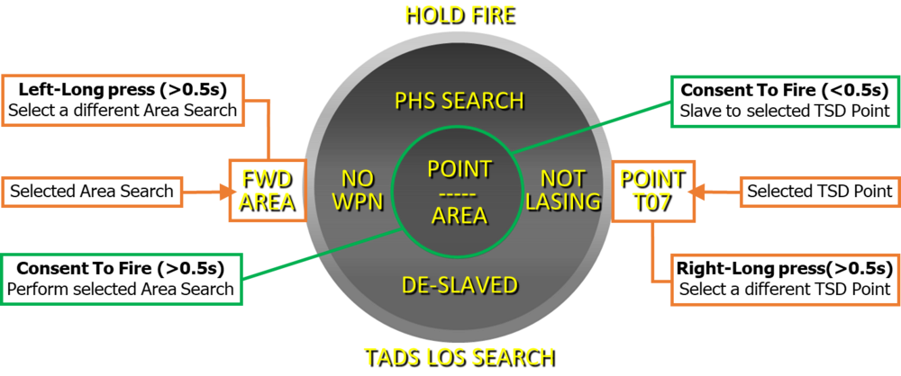 In the next DCS update, George AI Copilot/Gunner (CPG) will be receiving a significant upgrade, along with some improvements to his existing logic and behavior, in an effort to make him more realistic, interactive, and capable. It is important to note that no changes have been made to any existing AI Interface commands or control functions. Rather, additional commands have been added to the AI Helper Controls (Left/Right/Up/Down) when the AI Interface is displayed and set to NO WPN, and the Consent To Fire command has been modified as a contextual, multi-purpose button. In the graphic below, the new AI Interface is shown, with the new commands identified. New search tasks (explained below the AI Interface graphic) may be configured using the Left-Long and Right-Long commands while the AI Interface is set to NO WPN. The function of the Consent To Fire command under the current conditions is displayed in the center of the AI Interface, with the short press (<0.5 seconds) function displayed above the long press (>0.5 seconds) function below it. It is worth noting that the Consent To Fire commands may still be used without displaying the AI Interface. For example, if the player wishes for George AI CPG to begin performing an Area search, a long press of the Consent To Fire button may be used without the AI Interface displayed. However, to select a different Area search, the AI Interface will need to be displayed and set to NO WPN. New Search Tasks Up until now, George AI CPG could only be commanded to perform a direct, momentary search for targets along the line-of-sight of the Pilot’s helmet or the TADS sensor turret, and would rank those targets based on threat priority (i.e., air defense units would be at the top of the list). The player may now choose from 7 additional methods for George to search for targets, facilitated by the new changes in the AI Interface. Direct Searches. These are two searches that George was already capable of performing up to this point. PHS SEARCH - George slaves the TADS to the line-of-sight of the Pilot Helmet Sight (PHS) and performs a momentary search for targets. Targets are ranked by threat priority. TADS LOS SEARCH - George performs a momentary search for targets along the current TADS line-of-sight. Targets are ranked by threat priority. Area Searches. These searches allow George to proactively search for targets in a designated area or based on FCR target locations, visually identify FCR targets prior to an engagement, or perform battle damage assessment of engaged FCR targets after an engagement. FWD AREA - George slews the TADS in a 90-degree search pattern directly in front of the helicopter and continuously searches for targets. George will verbally announce when targets are detected but will not generate a Target List unless the AI Interface is displayed. Targets are ranked by threat priority. PHS AREA - George slaves the TADS to the line-of-sight of the Pilot Helmet Sight (PHS) and then slews the TADS in a 45-degree search pattern centered on the PHS-directed azimuth in relation to the helicopter nose and continuously searches for targets. George will verbally announce when targets are detected but will not generate a Target List unless the AI Interface is displayed. Targets are ranked by threat priority. FCR TGTS - George generates a Target List based on FCR target data obtained by the onboard FCR scans performed by the player or received across the datalink via FCR TGT Report or RFHO. George will enable C-Scope and attempt to identify the FCR targets highlighted in the Target List. If the target cannot be seen due to visual obstructions, George will verbally announce it. If the target is destroyed, George will verbally announce it and remove the target from the Target List. OWN PFZ - George slaves the TADS to the PFZ assigned to the ownship and continuously searches for targets within the geographical boundaries of the zone. George will verbally announce when targets are detected but will not generate a Target List unless the AI Interface is displayed. Targets are ranked by threat priority. ACTV PFZ - George slaves the TADS to the activated PFZ and generates a Target List based on FCR target data obtained by the onboard FCR scans performed by the player or received across the datalink via FCR TGT Report or RFHO. George will enable C-Scope and attempt to identify the FCR targets within the geographical boundaries of the zone and highlighted in the Target List. If the target cannot be seen due to visual obstructions, George will verbally announce it. If the target is destroyed, George will verbally announce it and remove the target from the Target List. Point Searches. These searches allow George to search for targets in the vicinity of a TSD point or the FCR Next-To-Shoot (NTS) target after the Player has Linked the TADS to the FCR in the Pilot seat. POINT - George slaves the TADS to the selected TSD point to perform an indirect rocket attack from behind cover; or may be commanded to adjust the TADS field-of-view setting, toggle the selected sensor (FLIR or DTV), or fire the laser, to assist with performing reconnaissance. If subsequently commanded to search for targets, George performs a momentary search for targets. Targets are ranked by geographic proximity to the TSD point, regardless of unit type. LINKED - George may be commanded to adjust the TADS field-of-view setting or toggle the selected sensor (FLIR or DTV), to assist with performing visual identification or battle damage assessment of the FCR NTS target. If subsequently commanded to search for targets, George performs a momentary search for targets. The closest target that matches the classification of the FCR NTS target is ranked as the first target in the Target List, and all remaining targets are ranked by geographic proximity to the NTS target symbol, regardless of unit type. New capabilities and procedures George must be commanded to perform start-up procedures if spawning int