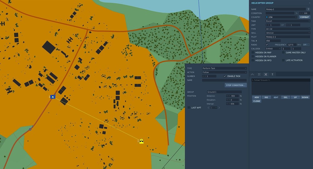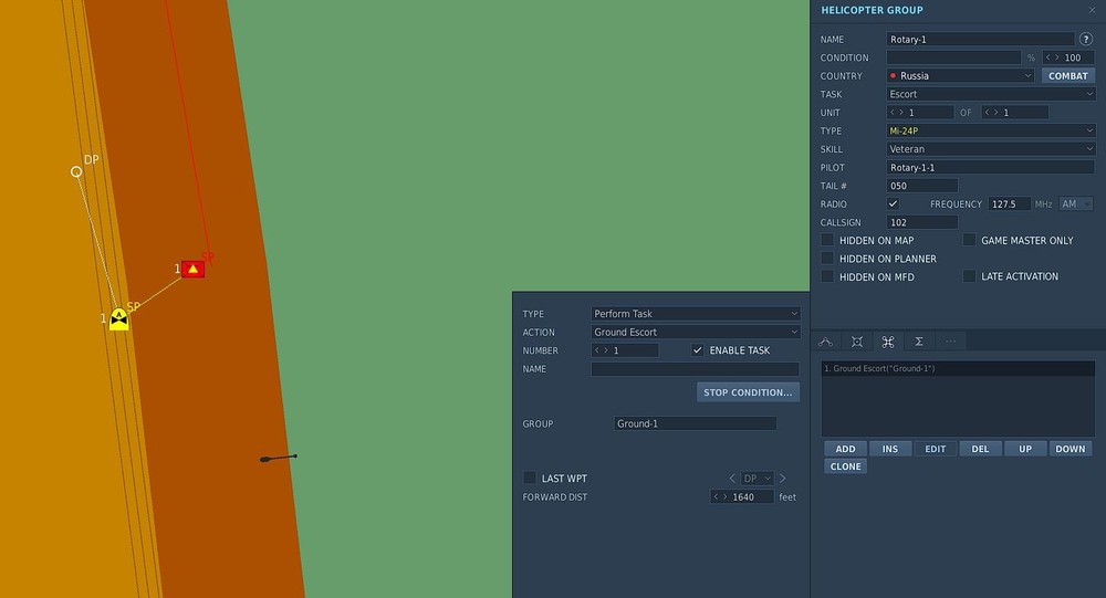 I tried to get the MI-24 to escort armor 'on road' and doesn't work. It's strange as it did work couple months ago in a mission I created but can't get it to work at all now. First I choose APC BTR 80 armor 'On Road' and next selected the MI-24 and choose 'Task, Escort'. Next for 'Triggered Actions' I selected Type Perform Task Action Ground Escort and Group 1 for the APC BTR 80 and for the life of me I can't get it to work. The helicopter always goes back to base without escorting. Am I doing something wrong and how can I fix it. See screenshot below. THanks in advance