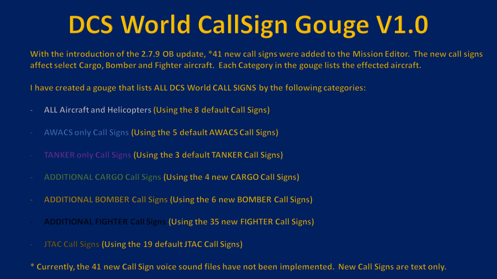 Greetings DCS Mission Planners. The end of year 2.7.9 OB Update added 41 new Call Signs to the Mission Editor. I've put together a little gouge that you may find useful. I also include instructions on how to update CombatFlite to be able to use the new Call Signs right away. Enjoy and have a great 2022! LINK TO DCS DOWNLOAD WHEN AVAILABLE: https://www.digitalcombatsimulator.com/en/files/3320063/ Cheers! Backy 51
