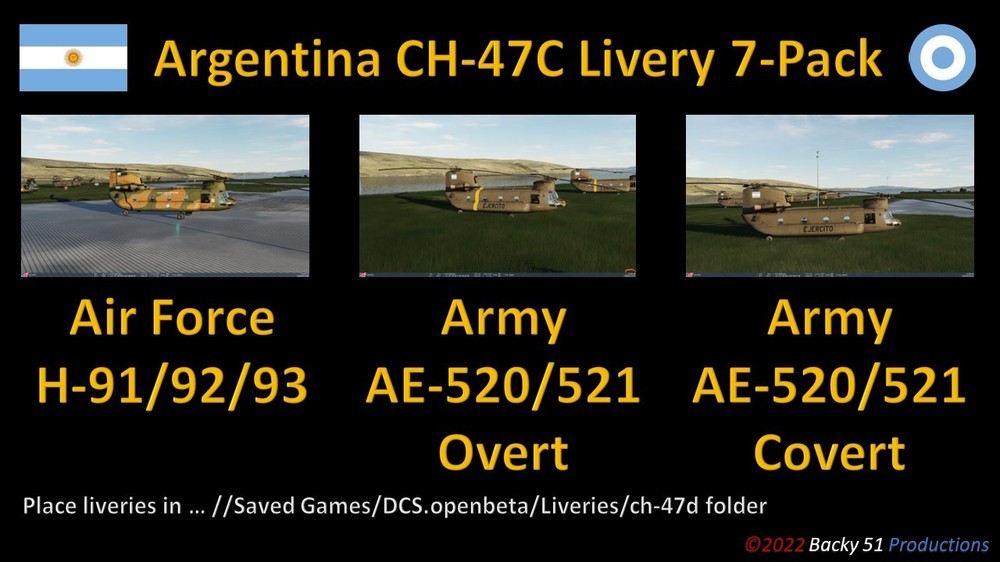 19. Argentina CH-47C Livery 7-Pack Three livery schemes of the Argentina Army and Air Force CH-47C Chinook helicopter suitable for use in the South Atlantic Map circa 1982. Link to Downloads section to be posted here when link goes live. LINK: https://www.digitalcombatsimulator.com/en/files/3324881/