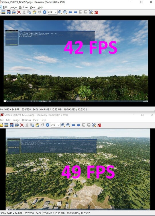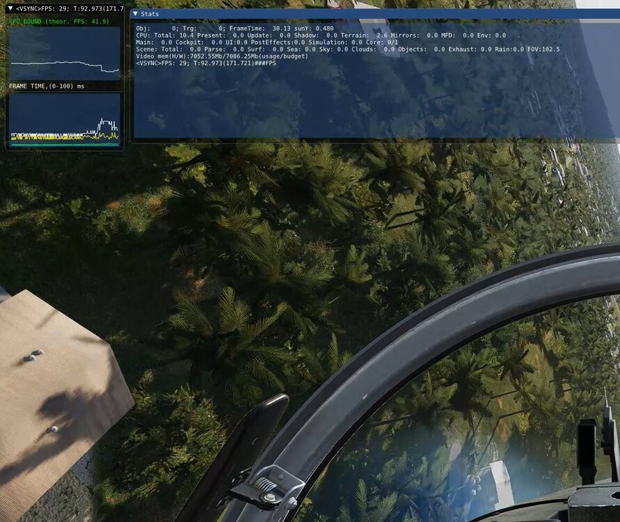 Yes, there is a problem with the in-game Vsync. I wasn't much into DCS in 2025 so I didn't notice. Thanks for pointing that out. But the trees are problematic, still. In a less dramatic manner, check out the attached comparison. Less objects/world visible (mostly filled with sky) - much less FPS. If that doesn't ring a bell I don't know what will. -
