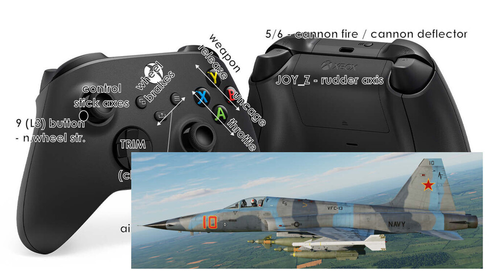 Do formation flying, take off and landings, combat using all weapons. The following axis settings are also suitable to make wonky joysticks usable. Mind that Xbox X S series controller is better than many full-scale joysticks on the market. Instructions: 1. Pair your controller and make it detectable in DCS (check Settings - Controls... it should have a dedicated column) 2. Exit DCS 3. Navigate to ...\SavedGames\DCS.openbeta\Config\Input\F-5E-3\joystick and BACK UP your controller setting file "Bluetooth LE XINPUT compatible input device*" 4. Copy and paste the whole content of the provided file 5. Launch DCS and verify correct mapping. AXIS TUNE SETTINGS: Pitch and Roll - JOY* Dzone 4 Saturation Y 80 Curvature 20 Rudder - JOY_Z* Dzone 3 Saturation Y 80 Curvature 15 Bluetooth LE XINPUT compatible input device {YOURUUID}.diff.lua