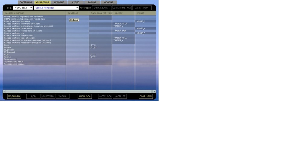 Не люблю плодить новые темы, по-этому спрошу здесь: хочу настроить приближение/удаление в кабине а10С на колесико под указательный палец на РУД (джой 52про). на всех остальных самолетах работает, а тут нет. зарезана на трекире ось Z. пробовал просто скопировать строки с Су-27 по мышке, трекиру - "0". как быть? p.s. почему есть настройки "а10С игра" и "а10С реал"? в чем разница и назначение?