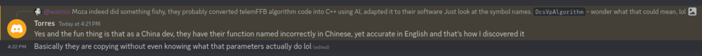 I'll provide some evidence supporting a possible GPLv3 violation. I've examined strings extracted from the Moza executable, which hint at an underlying connection to the open-source VPforce TelemFFB project. Within Moza's code, we see identifiers like vp_dcs and VpAlgorithm that incorporate the "vp" prefix, a clear nod to VPforce, though they don't exactly mirror VPforce’s original identifiers. This suggests that Moza's software may be a derivative work inspired by or partially based on TelemFFB. Given the technical leap from Python to C++, Moza likely used AI-powered tools, potentially GPT-based, to translate parts of the Python-based TelemFFB core code into C++ for their compiled binary. If Moza's code does indeed derive from TelemFFB, GPLv3 would require them to release their own source code under the same open-source license, something they haven't done. This evidence suggests that Moza may have created a derivative product based on TelemFFB without complying with GPLv3, raising concerns about a possible license violation. Next we see hastily 1:1 copied effect adjustment names They even copy pasted damage variables into their export.lua (even the line endings match!) So to summarize (thanks ChatGPT)