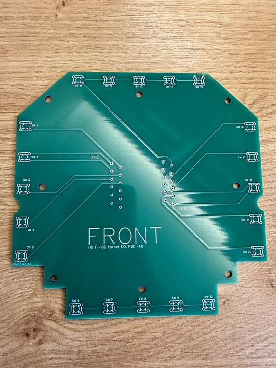 Hi All, Up for sale are a bunch of PCBs that I’ve designed recently for a project I’m no longer pursuing. As such, they’re going cheap as I’d rather someone make use of them rather than have them sitting in my drawer. There are a few different types: Type 1: F-18C DDI PCB (green; designed for tactile switches). Designed to be used with WAGO 250-412 connector blocks or wires soldered directly to the holes. Type 2: F-18 UFC PCB (designed for tactile switches with built-in LEDs). Designed to be used with WAGO 250-222 connector blocks but wires can be soldered directly to the board holes also. Type 3: F-18 DDI PCB (green; designed for tactile switches with in-built LEDs). Designed to be used with WAGO 250-222 connector blocks but wires can be soldered directly to the board holes also Type 4: F-18 DDI PCB (black; designed to be used for tactile switches). Designed to be used with WAGO 250-222 connector blocks but wires can be soldered directly to the board holes also. I’ll send over the CAD drawings for anyone who buys any so that you can use the measurements to design housings etc (ie using a 3D printer). If needed, I’ll also share links to buttons/components needed to complete the builds I’m looking for £15 for each (includes postage and Paypal) but can happily do discounts for multiple orders. Thanks