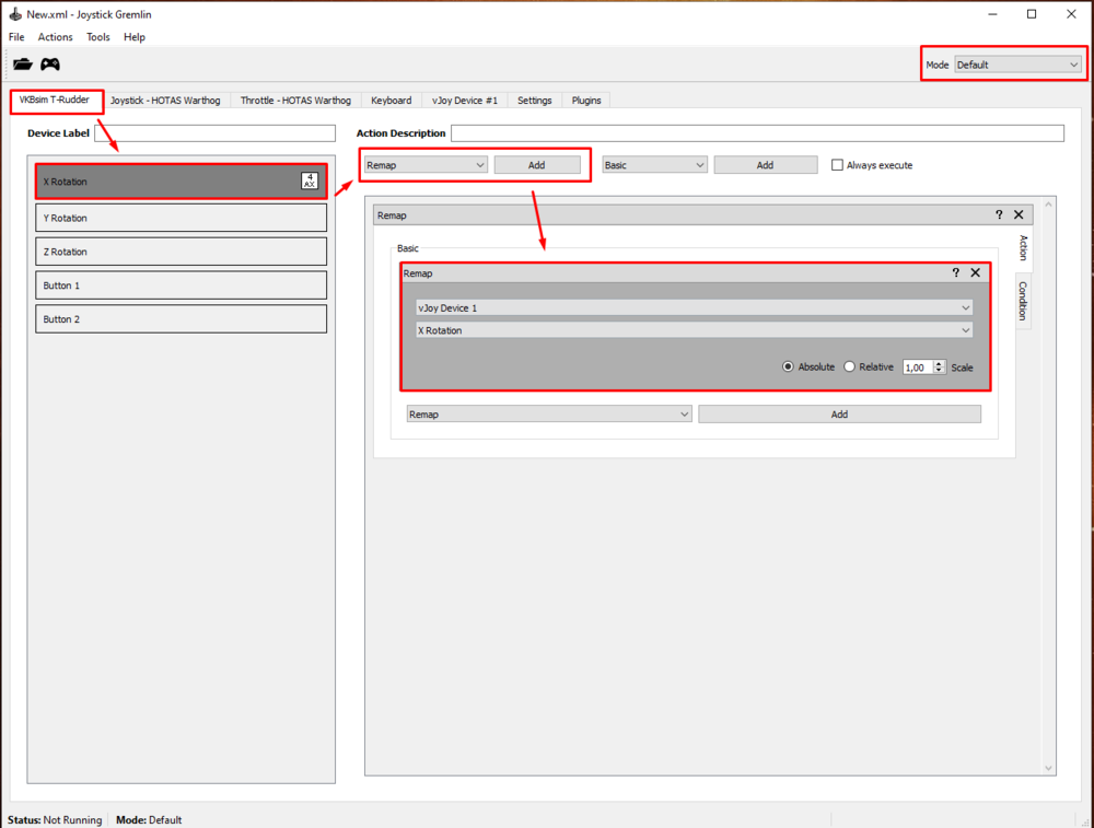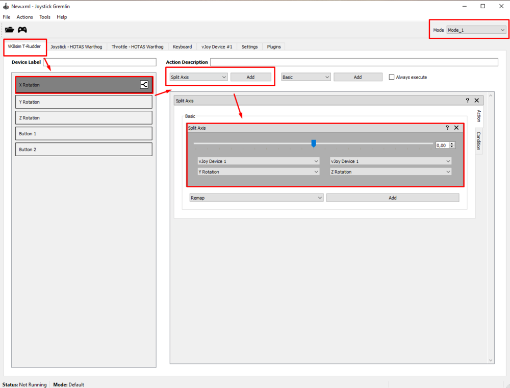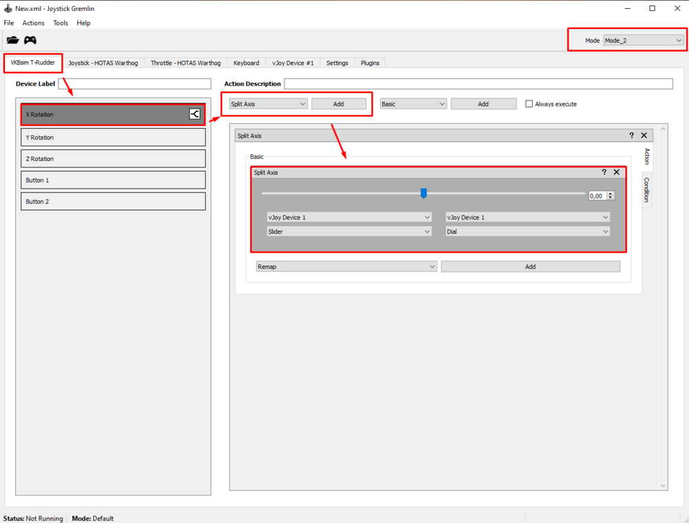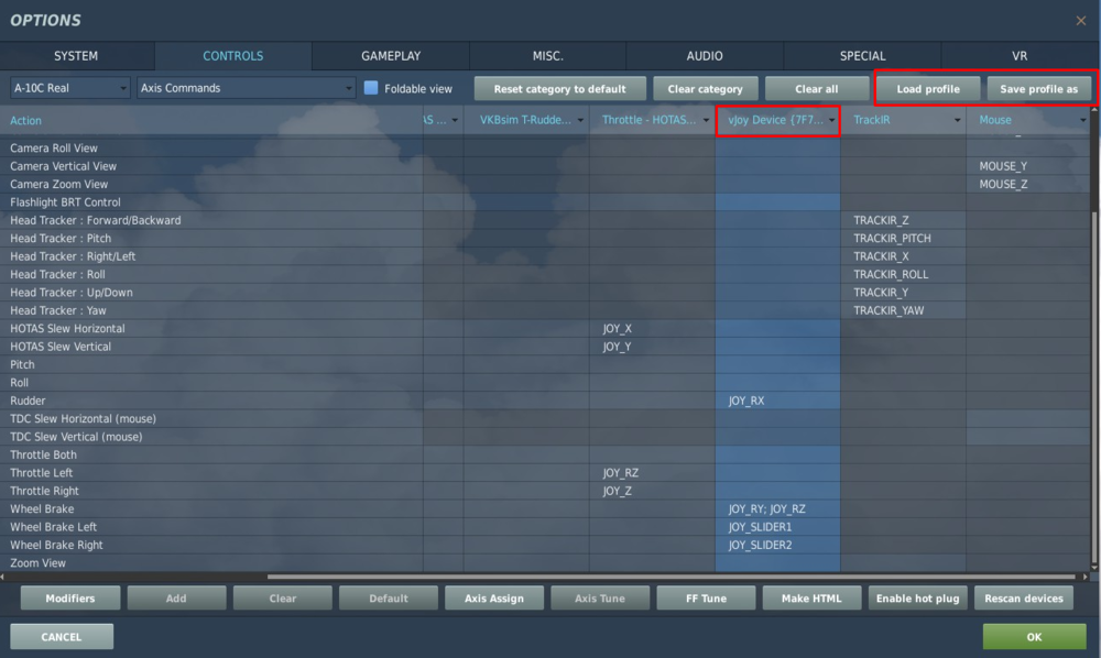 I struggled to set up virtual axes for VKB T-Rudder Pedals exactly how I wanted, so I made this short guide. As you know, VKB T-Rudder pedals are rather unique since they only have one physical axis (and with pedals moving up/down) and there are no toe brakes. Obviously we can use the physical axis to control rudder and nose wheel steering but we have to create virtual axes if we want to control wheel brakes too. The best way (imho) to set it up is a software called Joystick Gremlin (combined with vJoy driver). With it you will be able to create virtual axes for wheel brakes and use them without interfering with the main axis assigned as a rudder. Here is an overview of what we are trying to get: Below is a step-by-step guide how to set it up: First you need the vJoy driver that will emulate a virtual device. You can download vJoy here: https://sourceforge.net/projects/vjoystick/ After the installation you need to configure your vJoy profile with (surprise, surprise!) “Configure vJoy” app: For the above setup to work you need 5 vJoy axes. In my case, I have selected RotationX, RotationY, RotationZ, Slider1, Slider2: Verify if vJoy is working correctly in Windows’ Game Controllers (Run command: joy.cpl). It should be visible on your device list: Now you need to download Joystick Gremlin. You can find it here: https://whitemagic.github.io/JoystickGremlin/download/ After the installation, the first thing you need to do is to set up “modes”. In Joystick Gremlin you can use multiple profiles and each profile can have multiple modes. That’s exactly what gives us the possibility to use physical axis only as a specified virtual axis. You need to have (at least) 3 modes in total. Create the additional ones in Tools>Manage Modes: In my case I have named them “Mode_1” and “Mode_2”: Now, the actual Joystick Gremlin configuration. We’ll start with the default mode that will use as a regular rudder / NWS input. Check in Windows Game Controllers what is the name of your working axis in VKB T-Rudder. In my case it’s Rotation X axis. Select VKB T-Rudder device tab and remap the physical axis to one of 5 vJoy’s axes (in my case: vJoy Rotation X axis). As a result VKB T-Rudder axis will be duplicated 1:1 as a vJoy input. Next step is to assign two (different) modifier buttons that we will be using to switch Joystick Gremlin modes. The best option is to use buttons on the throttle, since we want to be able to control thrust at the same time. Select button that will act as the modifier (in my case I have selected the slew push button on Warthog throttle), add function “Temporary Mode Switch” and select the first additional mode (in my case: Mode_1). With help of this function, as long as you hold the designated modifier button, Joystick Gremlin will generate input only in accordance to the assigned mode (other modes will be inactive as long as you hold the modifier button). Repeat the above step for your second additional mode, with use of a different modifier button. In my case I have binded Warthog Throttle Button 15 as a Temporary Mode Switch for Mode_2: Now switch Joystick Gremlin to your first additional mode (upper right corner). We will use this mode to create virtual axes that will act for dual wheel brakes (meaning pressing left or right pedal will act as pressing both wheel brakes in game). In VKB T-Rudder tab select your working axis and create “Split Axis” function to 2 virtual axes from vJoy (different from vJoy axis used in the default mode). In this case I have split VKB’s Rotation X axis into vJoy’s Rotation Y and Rotation Z axes: Switch to your second additional mode and repeat the above step (use different vJoy axes than in previous modes). We will use this mode to create virtual axes that will act as left/right independent brakes (meaning pressing the left pedal will act as left wheel brake in game and pressing the right pedal will act as right wheel brake in game) – useful for taxiing in WW2 planes. In this case I have split VKB’s Rotation X axis into vJoy’s Slider 1 (“Slider”) and Slider 2 (“Dial”): That’s the minimum configuration. You can also create additional setting for each vJoy axis (edit curvature, invert it) if you wish. I use DCS in game settings for that. Finally save your profile and activate it. Joystick Gremlin must be running in background so you can use vJoy axes like above. You can also set additional options: So, now all there is left to do is to assign axes in DCS. Clear your VKB T-Rudder bindings and map your newly configured vJoy axes: That’s how it looks like in my case: Side note - in DCS we can assign vJoy axis from the drop down list, which is very convenient. In sims that have no such option, you may need to use a software that will hide VKB input so you can bind vJoy axes correctly (Joystick Gremlin can do this with help of additional plugins). Tune your virtual axes. If you haven’t configure it in Joystick Gremin, you need to check the boxes “invert” and “slider” for all 4 virtual axes used for wheel brakes: For the main vJoy rudder axis, no changes are required (apart from adding some curvature and deadzone). To be able to quickly assign vJoy axes like above in different DCS modules, save profile of your created vJoy mapping and load it in axis assign window for other DCS aircraft (while vJoy column is selected). Don’t forget to clear VKB T-Rudder bindings. Now, all you need is to get used to how the virtual axes work. You press and hold the modifier button à use VKB pedal à release VKB pedal à release the modifier button. If you release the modifier button with depressed pedal, the virtual axis input will stay at this level. You can use it as virtual parking brake, but otherwise it’s more problematic than useful. Also, don’t forget that if you use the same buttons as modifiers in Joystick Gremlin and in DCS control settings, you will be disabling your main rudder axis control every ti