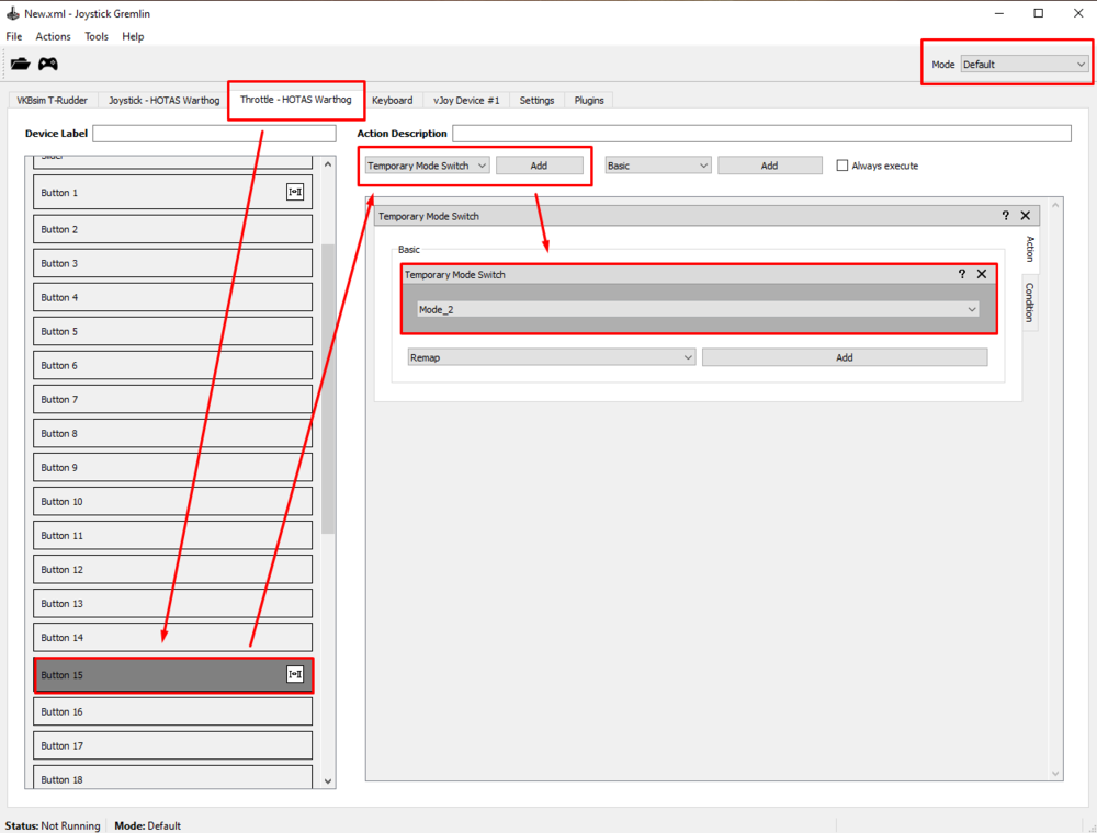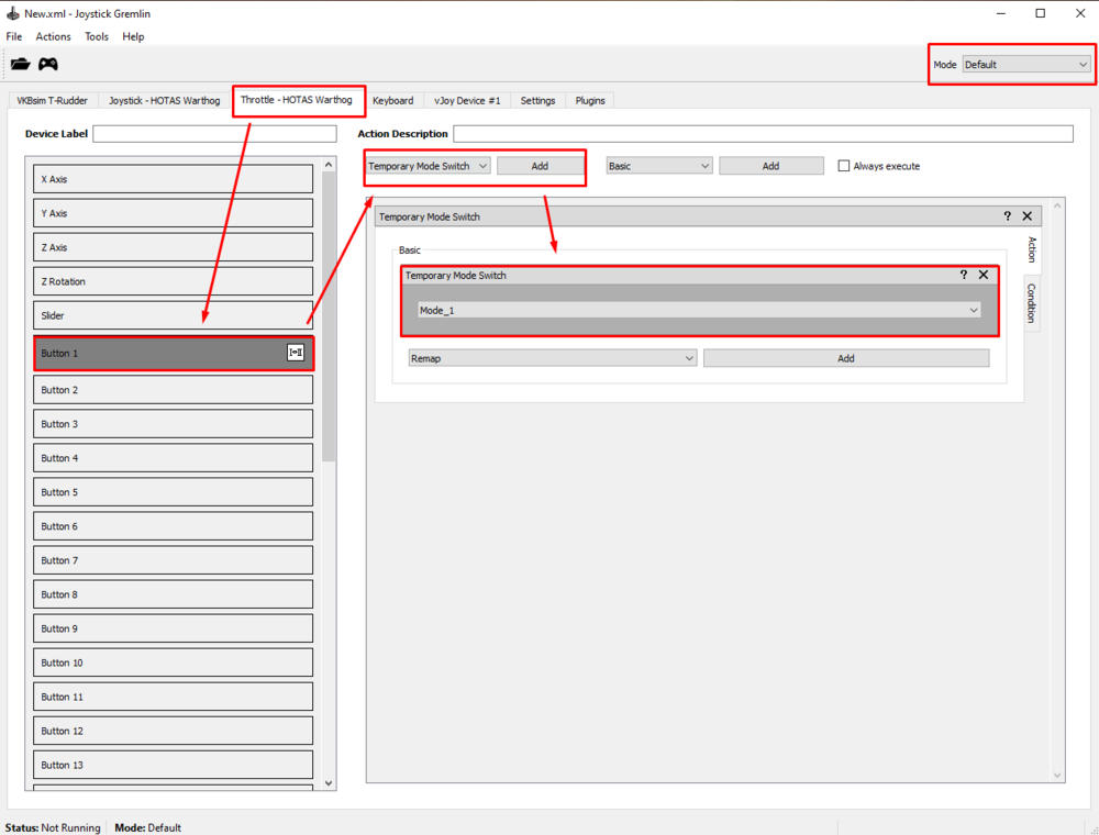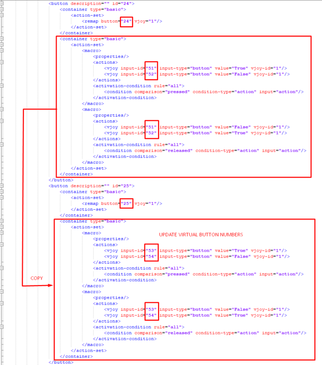 Thank you for this guide. I struggled for a second a little but overall it pointed me in the right direction. Regarding step 4 maybe it would be useful to post complete picture: In this case Warthog Button #24 (EAC ARM/OFF) is duplicated as vJoy #24 and for toggle switch - as #51 and #52. I also recommend editing the profile xml file to set up new toggle switches. It's probably the fastest way. I use Notepad++ for this. All we have to do is to copy and paste section from one button to another and rename the virtual toggle switch buttons: Also I don't fully agree with the 3-way toggle switch setup. The guide suggest doing it with 3 virtual buttons (i.e. middle position shares the same virtual button), but I struggled with binding it in DCS correctly because we cannot use the same button for different functions. So for my test - UH-1H armament toggle switch OFF-SAFE-ARMED, I had to configure Warthog Autopilot mode switch it like this: Warthog #28 (ALT) is vJoy #58, Warthog # 27 (PATH) is vJoy #55 and Warthog ALT/HDG in this case is vJoy #56 (UP --> MIDDLE) AND #57 (DOWN --> MIDDLE). Then I could bind it like this: That's the only way I got it working exactly as in the cockpit: Maybe it depends on how keybindings are designed for the specific module. It's also worth to mention that when using the toggle switches we must always remember to synchronize toggle switch position in-game (in cockpit) with toggle switch position on our HOTAS (using mouse in cockpit). Otherwise it will work backwards.