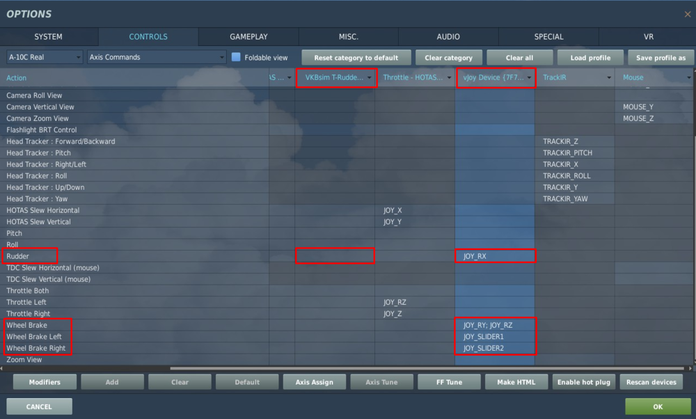 Technically, you can do it - as I have posted before: Here are the settings that I had: Axis 7 - RX - main axis (rudder) Axis 6- RZ - virtual right Axis 8 - RY - virtual left (sorry for the mess ) BUT this makes sense to use only if you want to bind your main axis OR two virtual axes. You cannot bind them all, because even with modifiers main axis will always be generating input. So you will be using your toe brake but also rudder/NWS at the same time. The reason for it is simple, modifier blocks input from the SAME unmodified source. And in this case all these axes act as separate sources. So, as far as I know, to have a possibility to actually use all 3 axes at once, you need some software running in the background and a virtual device (vJoy) for it. You simply won't be able to configure it so when you use your virtual axes your main axis is blocked from generating input. Unless modes in Gladiator work differently, but somehow I doubt that. Other solution would be to have a possibility to select what source should be blocked when using modifier in DCS. But I don't think that this is a popular request, so it's unlikely that it will ever be added. -