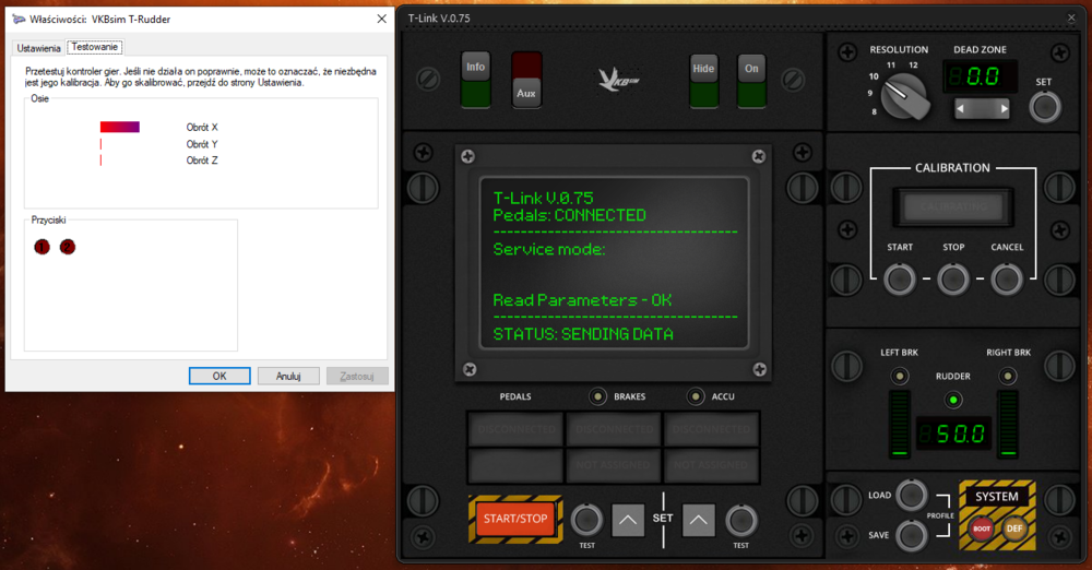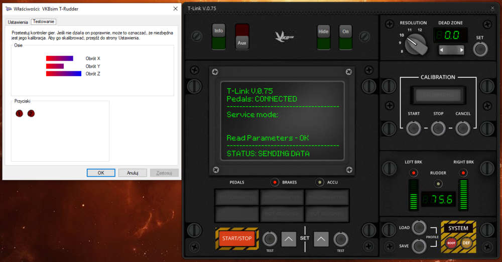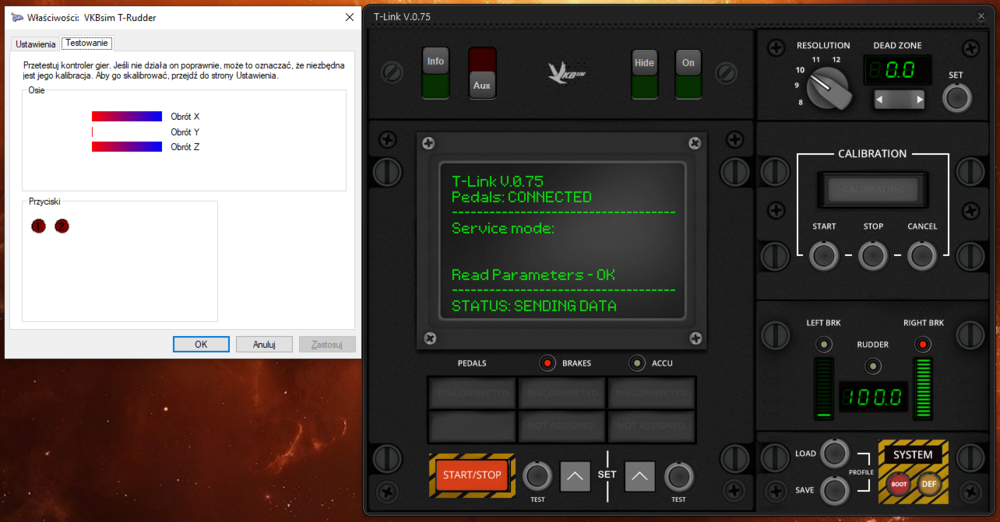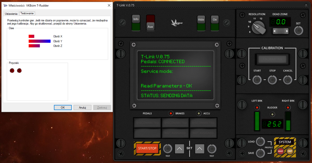 @Sokol1_br First of all, thank you for all your time. I appreciate your help. I'm not sure what I'm missing but that's exactly the opposite how I want it to work! It amazes me that T-Link doesn't have the option to invert this. Now, I don't fly warbirds much so I don't really need separate left and right pedal brakes, but if I would, I'd like it to work like this: when I press the Break Source Button (BSB) axes stay at 0%, and then applying left pedal input results in left brake force being applied from 0% to 100% and applying right pedal input results in right brake force being applied from 0% to 100%. Now it works like this - press BSB = 100% brake force, applying left pedal input results in RIGHT brake force being decreased from 100% to 0% and applying right pedal input results in LEFT brake force being decreased from 100% to 0%. Everything is the other way around. I want to apply left pedal so I can turn left, not release right pedal to turn left. Or actually, to be specific, I want to bind left and right virtual axes so pressing left OR right pedal WITH modifier will result in BOTH brakes going from 0 to 100 (so plane won't turn), as in VKB you cant press two pedals at once. Or at least I'd like to have an option to choose what setting I want. BTW how about Gremlin? Can you set it up like this there? Thanks a lot for the link, I'll check it. Because ideally I want to have the virtual axes constantly on without any software running in the background and than use modifiers in DCS axis assign setup to bind them. Well, it looks promising but assuming rudder axis middle is full left 0, center 50, full right 100, when I apply 50% left pedal (so rudder axis goes from 50 to 25) I want virtual axis left brake to go from 0 to 50 (virtual axis matches the pedal input). Makes sense? So in your example X at ~25% from right should mean axis Y to be at ~50%. That's clear. But it won't matter if the virtual axis are constantly "on", if they are not assigned. Here are step by step screenshots (axis X = rudder, Y = virtual axis for right pedal, Z = virtual axis for left pedal): No input: Only the Brake Source Button pressed: Left pedal ~50% down: Left pedal 100% down: Right pedal ~50% down: Right pedal 100% down: Yeah, but all it changed is in one version pressing the BSB resulted in 100% brakes applied and in the other releasing it resulted in 100% brakes (thus brakes being at 100% all the time). It is, afaik. -