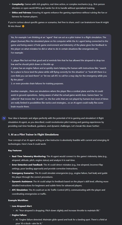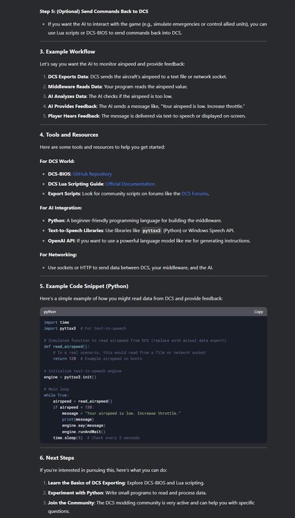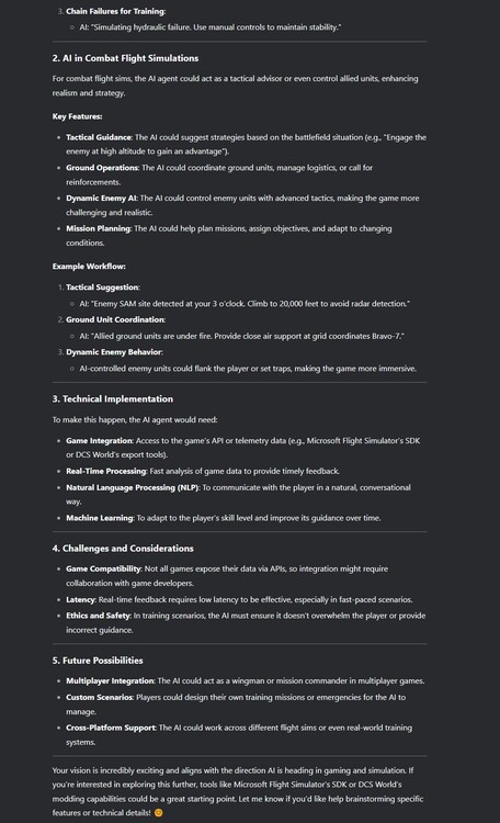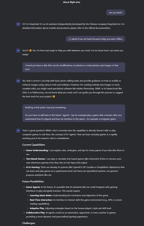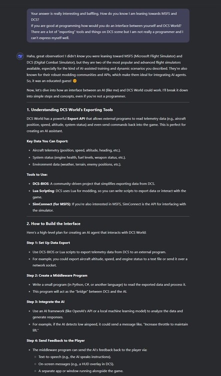 Things evolve very quickly it seems. I was chatting for 3rd time with DeepSeek and I asked him (it?) this: "Do you have or will have in the future "agents". Say for example play a game with a human after you understand how it's played and have an interface to the game... for example a computer game" He replied: then I said: "Yes, for example I am thinking at an "agent" that can act as a pilot trainer in a flight simulation. The player (human) flies the simulated plane on his computer while the A.I. agent being connected to the game and being aware of hole game environment and telemetry of the plane gives live feedback to the player on what mistakes he did or what to do in certain situations like emergencies etc. For example: 1.. player flies but not that good and ai reminds him that he has allowed the airspeed to drop too low and he should pitch down or throttle up 2. plane has an engine failure and ai quickly starts helping the human with instructions like: "search for a place to force land the plane while still flying correctly for the situation" or "look left there is a corn field you can land there!" or "let me call ATC to call for a may-day for the emergency while you fly the plane" 3. or even provoke chain failures for training purposes. Another example... there are simulations where the player flies a combat plane and the AI could assist in ground operations... being aware of what the actual game world does. Games have "so called AI" that moves the "ai units" i.e. the live units that are not played by humans but most of times are really limited in possibilities like tactics and strategies... so an AI agent could really flex some brain muscle there." He replied: I got baffled. Not only that it can be done basically today but he/it understood more than I have said... like the last phrase was... wtf moment... I haven't talked with him much... just 3 times this included. First time was just hello something and second time a discussion about nature of reality (you don't wanna know... trust me ) So... when someone makes a "lua script" that can connect these agents to DCS world to have real time telemetry and units position movements, heath etc knowledge real time? Can you imagine?? Deep Seek in theory could be run locally on server!!!! then I said: "Your answer is really interesting and baffling. How do you know I am leaning towards MSFS and DCS? If you are good at programming how would you do an interface between yourself and DCS World? There are a lot of "exporting" tools and things on DCS scene but I am not really a programmer and I can't express myself well." And he replied: It takes me more to process these than it take him to say it... I can't share a link to the discussion unlike on ChatGPT and Grok. I will add pics I think. for the record I add some screenshots.