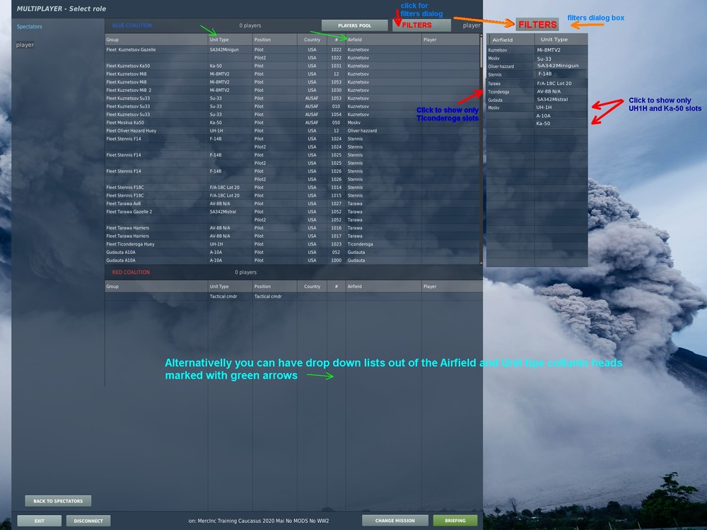 Something rather simple. Just as ED improved the Control Assigning interface, improvements could be added to multiplayer slots table for better ergonomics, declutter, esthetics, usability and learning of DCS. Something like in this picture. It can be a floating transparent window like the player pool but I guess that take a bit of performance and is more complex and not straight forward to use It can be a pop up side window like in the picture or Simple drop down lists in the place of Unit Type and "Airfield" columns heads just like the controls page have for different aircraft. If ED has the time... they could add a search box also, to easy search your plane, airfield, task,