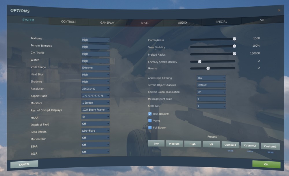 I tried, I observed that the hills behind Sochi-Adler airport are pretty empty on High when normally on Extreme they are very "forestrated" . Also some shadows don't work unless on extreme so I decided to pay the FPS pice just to have the world a little more believable. I also tested other combinations of SS and PD and 1.1 SS in OTT with even 1.6PD in game although gives better performance than simply 1.5 SS is still producing a too small picture for RiftS screen so jaggies appear. But I think for Rift CV1 might be the sweet spot. 1.1xSS with anything above 1.2x in PD and will provide good FPS. So for me I settled with 1.2x SS in OTT and then after much up and down I returned to 1.3xPD. 1.2PD Still is good and provides good FPS but is a little bit under 1.3PD in quality. For me is the other way around. Anything I am forced to play in SteamVR is worse than Oculus because it just another step added that will slow things down. For IL-2 for example I use Open Composite to switch the game to Oculus. Also in Oculus using Oculus Tray Tool is almost mandatory to be able to squeeze everything out. Oculus Home disabled, ASW disabled and constantly checked because sometimes it fails to enforce it OFF. -