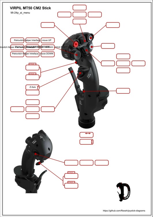 OK, I've managed to find the first problem. The images are OK but my viewer (Irfan View) doesn't display the picture just the rest... tables and text. Then there are the next issues: 1. The SVG file now has to be opened with something, right? It can't be used by DCS directly as a kneeboard for example. 2. The text spills over the boxes and looks bad or even hard to understand. 3. Sometimes the names of the buttons have gibberish words/letters 4. My stick for example is set up in Virpil software differently that what the program finds as default(?) so as a result the buttons are misplaced all over the place and the program things that are 17 buttons unassigned. In the second picture you can see how messy it loks and also I can tell you that buttons are misplaced. For example the left HAT (POV) is actually used for calling the Petrovich AI interface by pressing down then the directional buttons of that HAT are not assigned for Mi-24 Pilot and are used for Petrovich interface. However when I create the AI interface file that one the buttons are correctly assigned to that HAD... still the text is completly messed up though. See picture 3.
