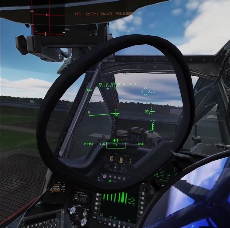 In most pictures I can see pilots have the monocle as close as a normal glasses only tilted because it needs to reflect the projected images. I wear glasses myself and the frame is visible only if I look for it and normally I cannot distinguish the whole shape of the eye piece, I need to scan around to quickly build a picture of a complete monocle/eye piece. But in game not only that the whole frame of the monocle is visible but a lot of space is around it which translates for it to be almost on the tip of the nose. Second picture shows how my view is projected in my Quest2 (don't worry about the fps... me strong stomach ) It's very cool for now as it is done but maybe with a mod it can be brought closer. Maybe a slider in special options like we have for the Ka50 HMD position.