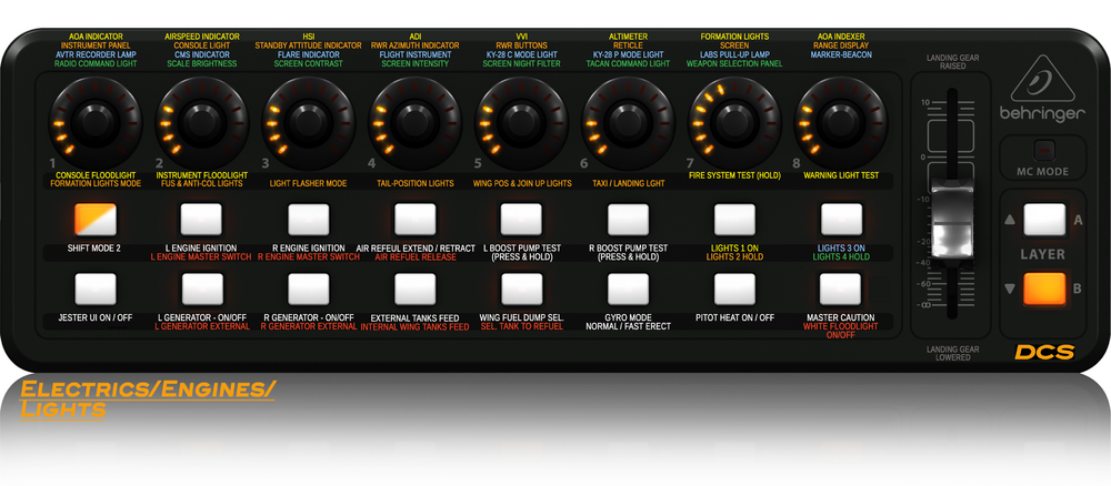 Just to share something that I've been working on. I'm a big fan of the XTouch Mini MIDI controller, and I've been leveraging it in conjunction with Bome MIDI Translator Pro, this s/w is a programmable interface for MIDI controllers. Cut a long story short, it allows me to map the MIDI controller to keyboard mappings for use with DCS. The following are a couple of layers that I've been working on, and I hope to get this wrapped up sometime soon. The goal is to get most of the functionality available and in combination with HOTAS bindings avoid using the keyboard altogether. The idea is that the left most 2 buttons (1 and 9) are reserved. Button 1 can shift between 3 modes, and can either be accessed via the button itself (Off, On, Blinking), and a different set of mappings are available for each mode. The behaviour can also be performed by a HOTAS binding as well. Also with this setup, you also have 2 layers, A and B and again you can switch between shift modes and layers and the buttons lights are remembered between each layer and mode. There are 8 encoders (dials) and those are assigned to different tasks, and the encoders can also be clicked to mimic push/hold/release/toggle etc. Also for some setups I've also added additional buttons to select other systems, for example one button can switch between TACACS and UHF, and another can switch between lights etc. Further programming is used for some situations, for example, 3 buttons are used for SLATS/FLAPS, and if one option is selected then the others are deactivated and vice versa. Button 9 is dedicated to integrating with the Jester UI, open it, navigate via encoder 1, select items, etc., and again this is common across any of the shift modes and layers selected. Anyway, something that I've been looking at recently and thought I'd share it with the folks here, and always keen to hear of anyone else using MIDI controllers with DCS. Thanks.