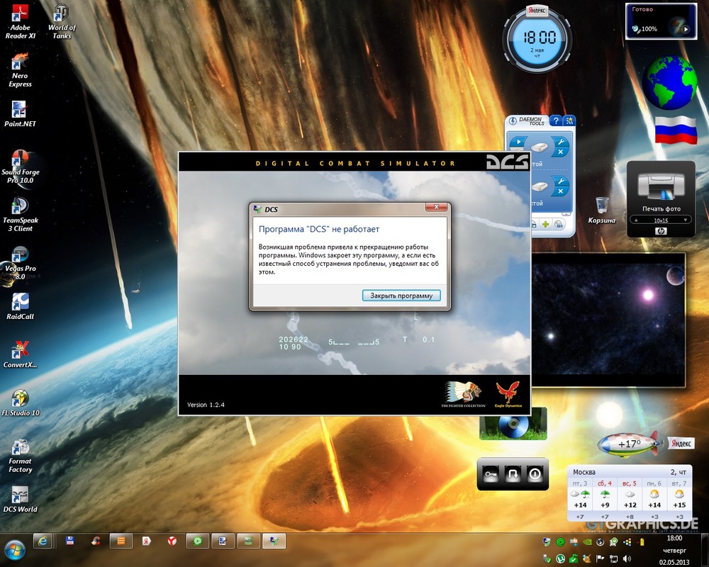 Я извиняюсь, но ничего у меня не висит, я снёс винду, установил новую, сразу же поставил DCS Word, без антивируса, и без всяких других программ, думал может конфликт где то, но в итоге тоже самое. Вылетает ошибка при запуске миссии, и при нажатии на вкладку - Управление - Так что тут по ходу что то с вашим лончером. Не может такого быть, все игры и программы работают как часы. А DCS не работает. Значит буду гонять старые версии ЧА И LockOn2.